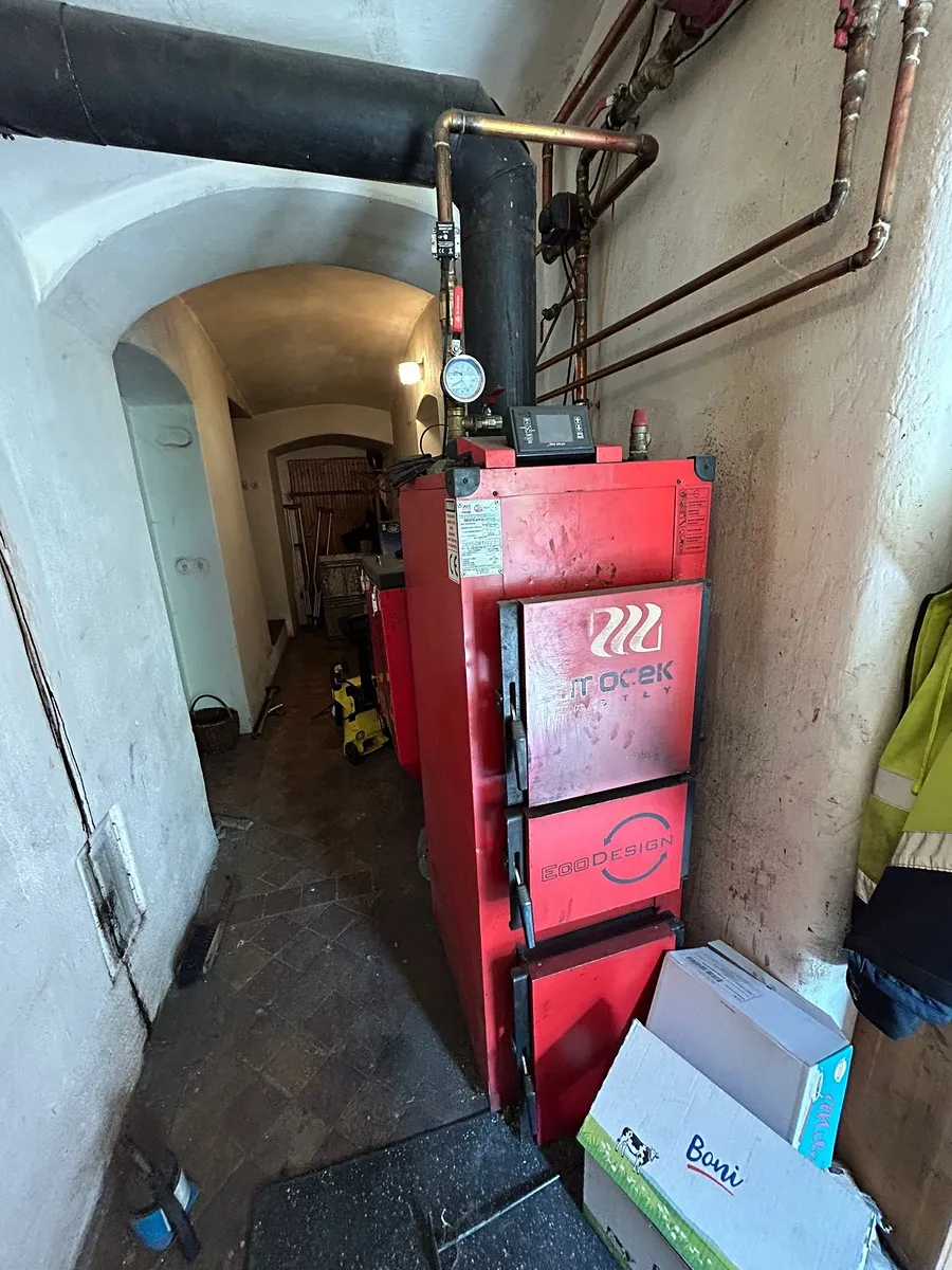 V předsíni naproti vstupu je umístěn kotel na tuhá paliva, rozvody topení jsou provedeny do závěsných radiátorů umístěných po celém domě, ve všech místnostech, včetně podkroví. Ohřev teplé vody je zajištěn elektrickým bojlerem, umístěným v koupelně. Dům je napojen na veřejný vodovod, kanalizace je do septiku, umístěného na sousedním pozemku (jiný vlastník).