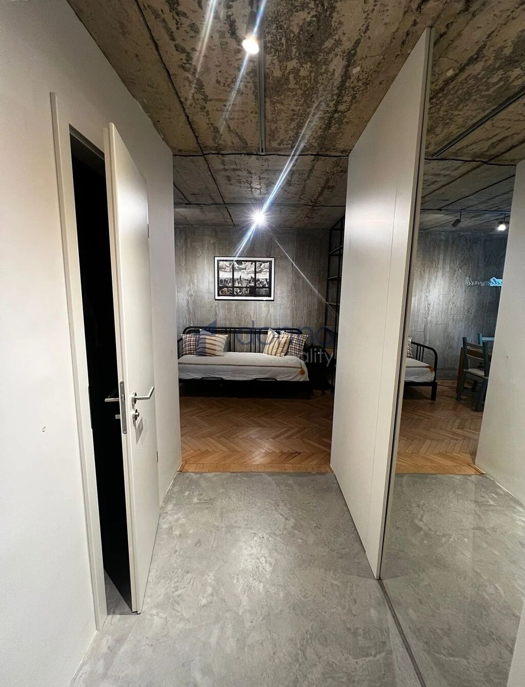 Moderní industriální design s odkrytými stropy, betonovými stěrkami a dřevěnou podlahou.