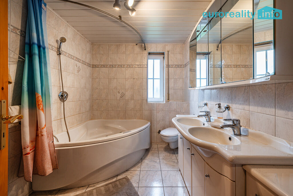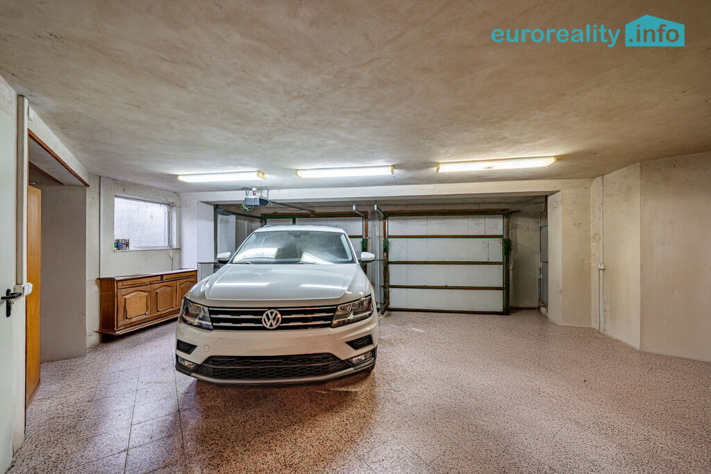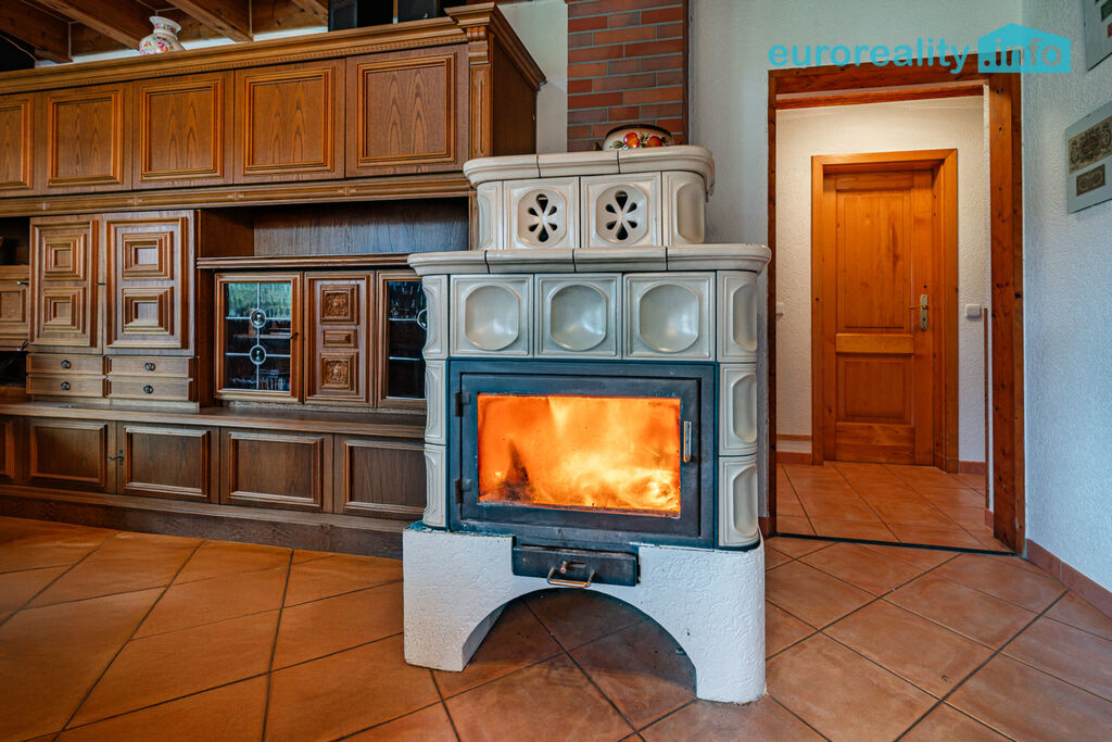 Dům nabízí také praktické vybavení, jako je garáž pro dva automobily a parkovací místa pro další dva vozy. Přívod vody je řešen skrze vrtanou studnu, což oceníte zejména pro zalévání zahrady. Topení zajišťují příjemná krbová kamna, která v zimě vytvářejí útulnou atmosféru.