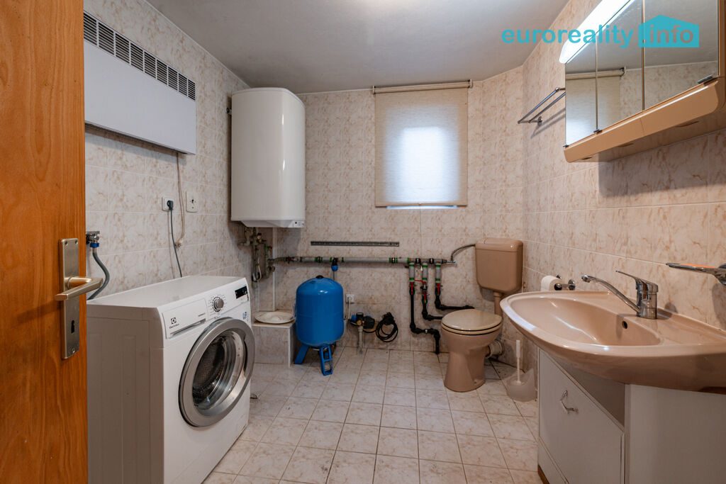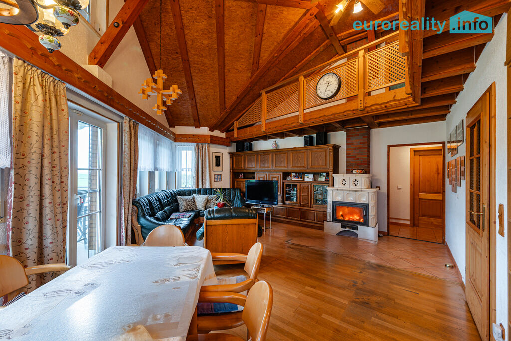 Dům nabízí také praktické vybavení, jako je garáž pro dva automobily a parkovací místa pro další dva vozy. Přívod vody je řešen skrze vrtanou studnu, což oceníte zejména pro zalévání zahrady. Topení zajišťují příjemná krbová kamna, která v zimě vytvářejí útulnou atmosféru.