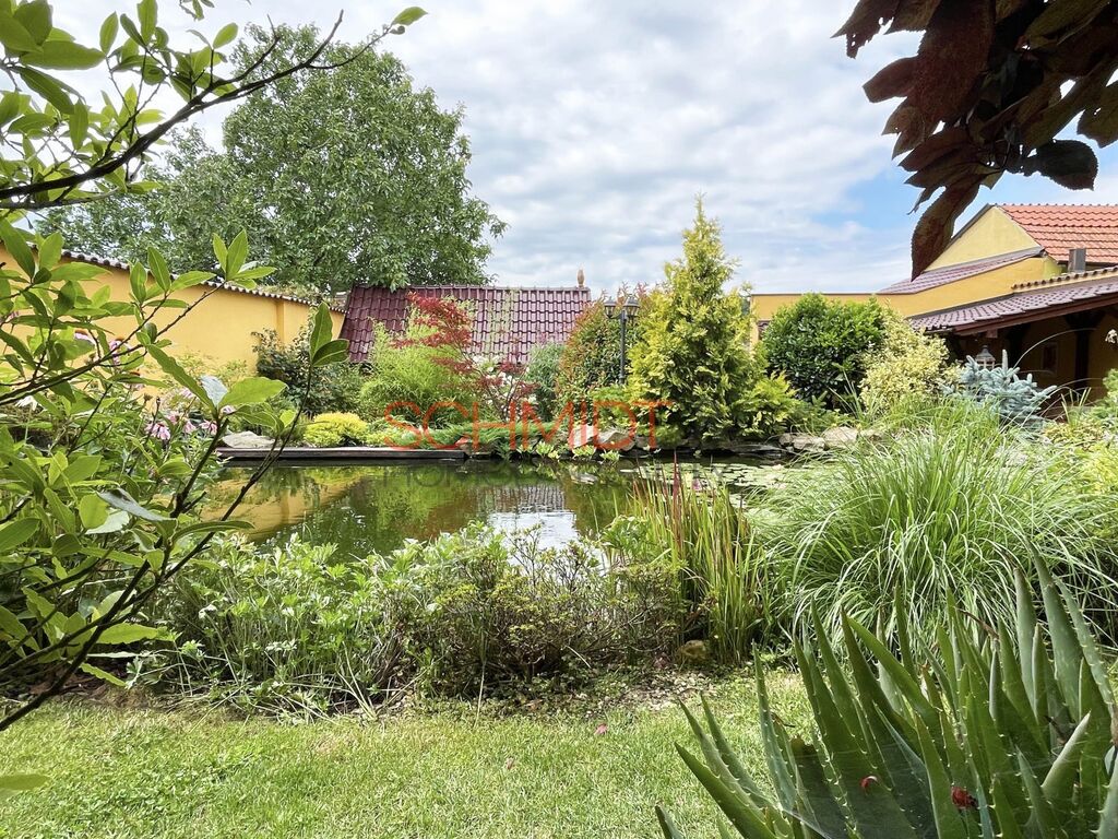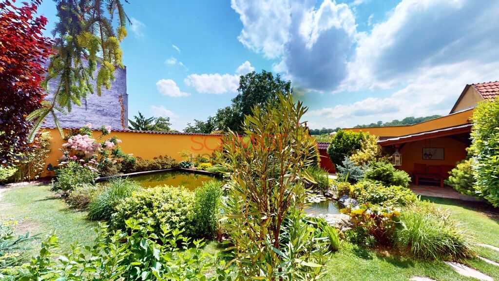 Zásadní proměnou prošla také zahrada. Okrasné části vedle domu dominuje rybník (50.000 litrů vody) s filtrací a kapry Koi, jehož okolí zdobí vzrostlé okrasné keře a rostliny. K posezení v tomto krásném prostředí slouží zastřešený altán. Červeným kvarcitem je provedeno vydláždění pochozích částí okrasné zahrady. Drobná hospodářská stavení slouží k uskladnění zahradního vybavení, případně chovu drobného zvířectva a dřevník k uchování dřeva do krbu. Celá část zahrady je kompletně osvětlená, je zde i rozvod elektřiny.