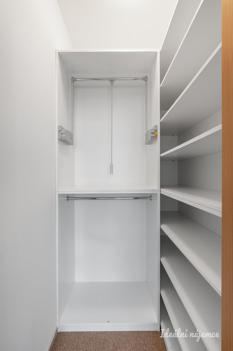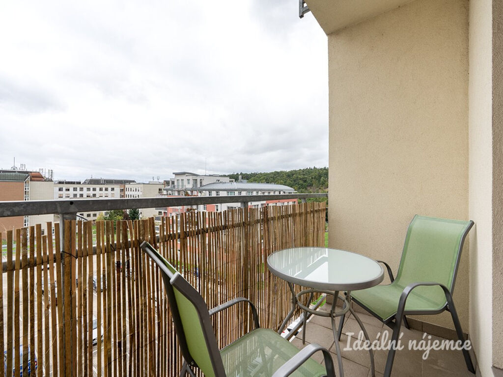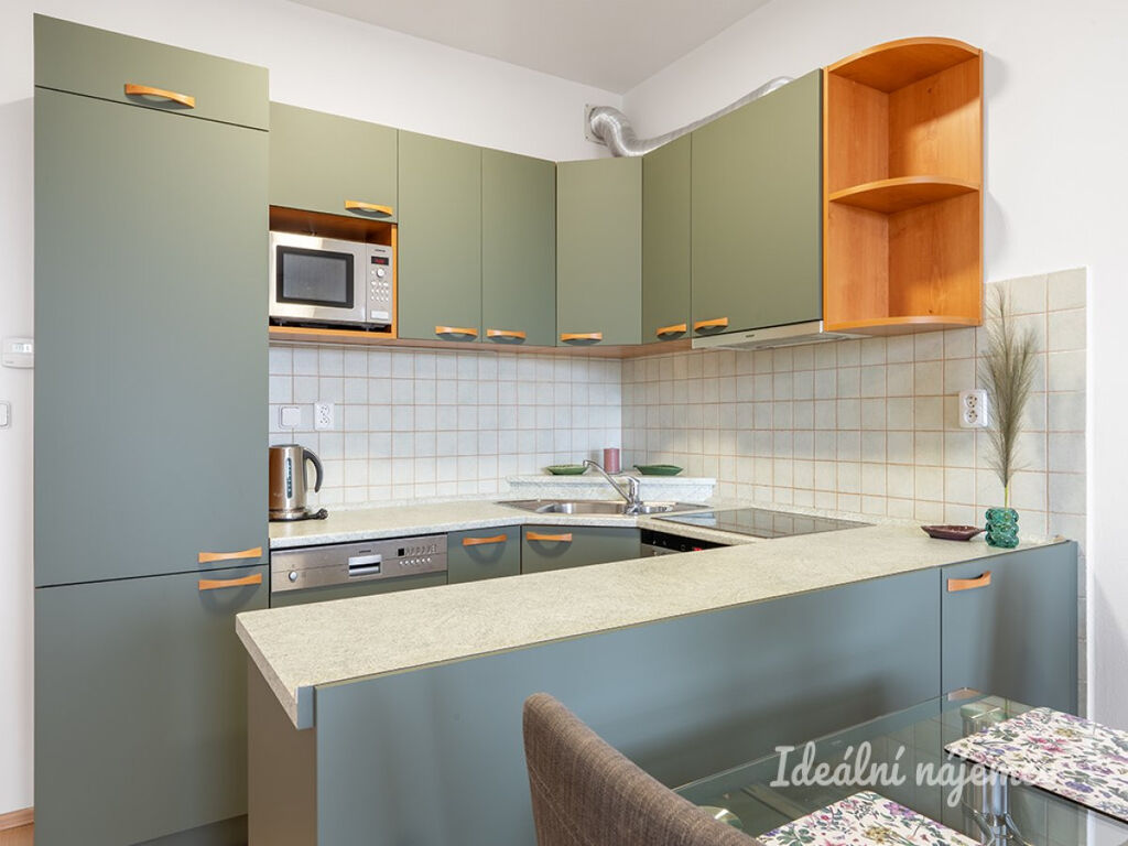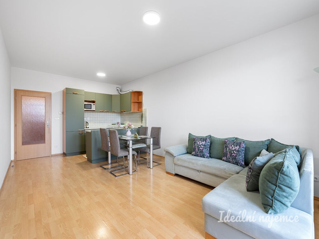 Byt je částečně vybavený, což dává novým nájemníkům možnost dotvořit si interiér podle vlastního vkusu. Moderní kuchyňská linka je plně vybavena – najdete zde lednici s mrazákem, elektrickou a mikrovlnnou troubu, indukční varnou desku, digestoř i myčku nádobí. Součástí kuchyně je také praktická komora s pračkou. Na kuchyň plynule navazuje obývací pokoj s pohodlnou sedací soupravou, jídelním koutem a přímým vstupem na balkon, který poskytuje příjemné místo k odpočinku. Byt dále nabízí dva samostatné pokoje, které lze využít jako ložnice, dětský pokoj či pracovnu. Koupelna je vybavena vanou, umyvadlem a pračkou, toaleta je samostatná. Velkou výhodou jsou také dvě úložné místnosti, ideální například jako šatna nebo komora.