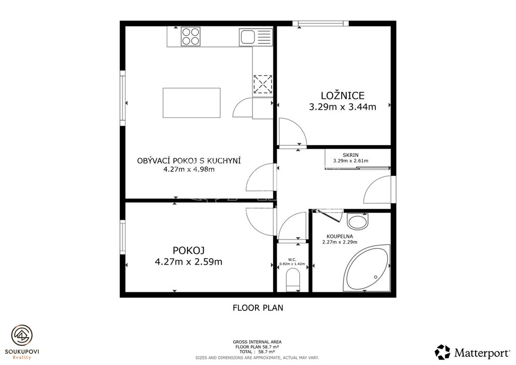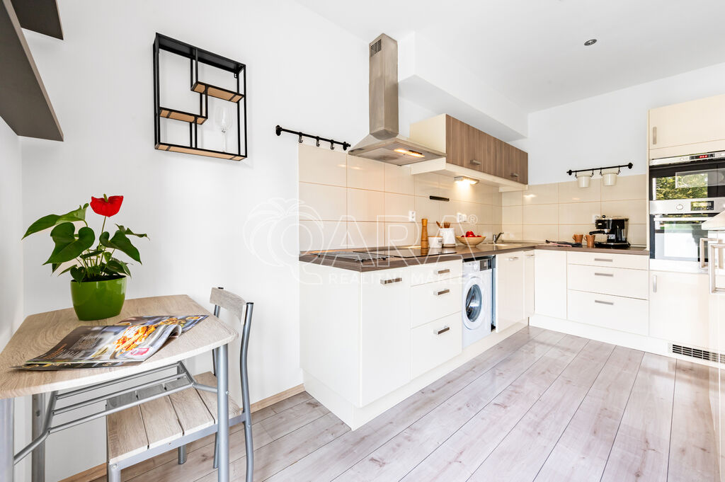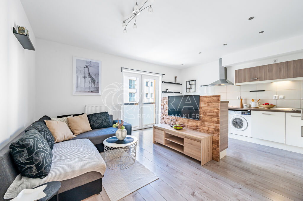 Byt je prakticky řešený – nabízí obývací pokoj s kuchyňským koutem, plně vybavenou linkou se spotřebiči (myčka, sklokeramická deska, trouba, digestoř i lednice s mrazákem).