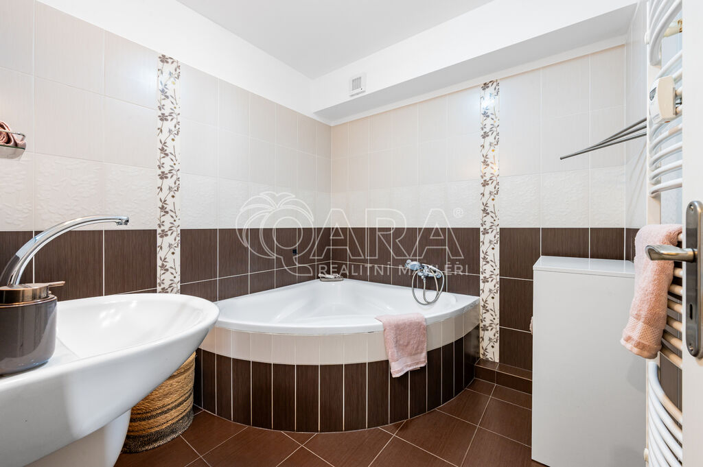 Dále ložnici orientovanou na severozápad, světlý dětský pokoj na jihozápad, předsíň s velkou šatní skříní, koupelnu s vanou a samostatné WC.