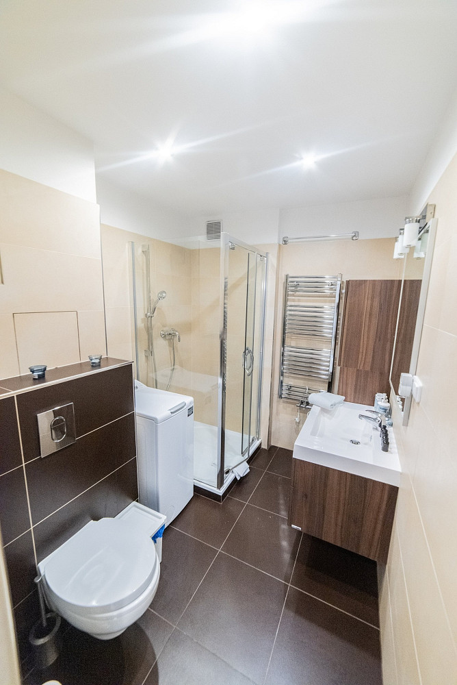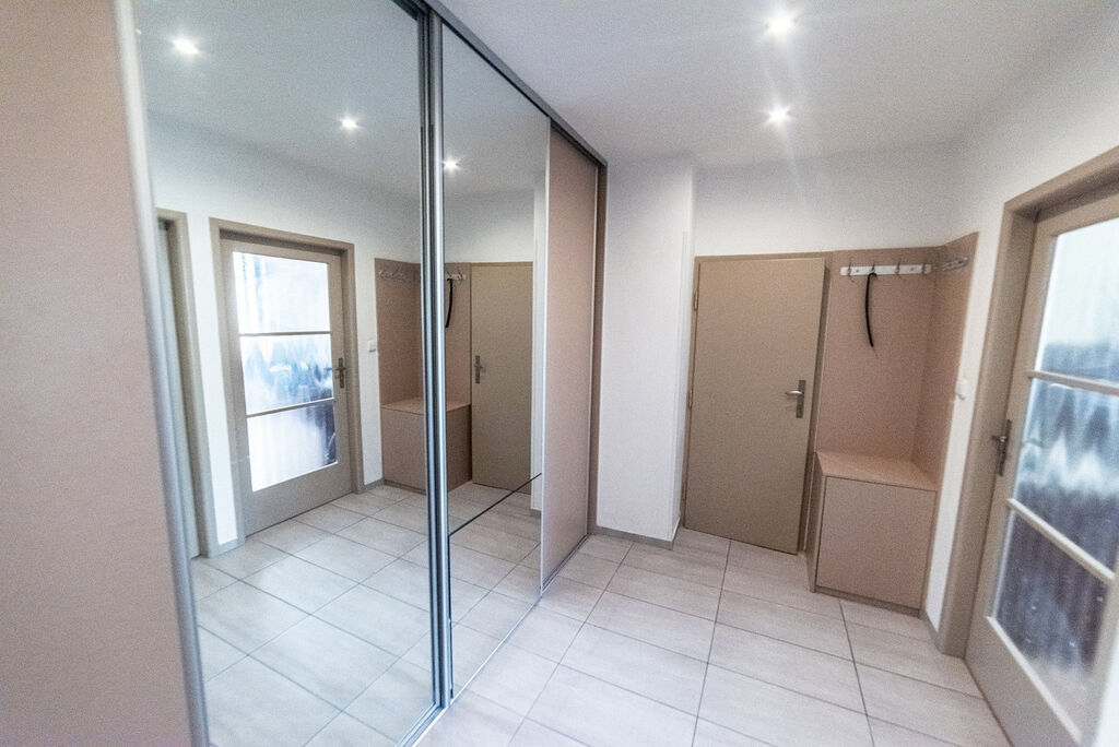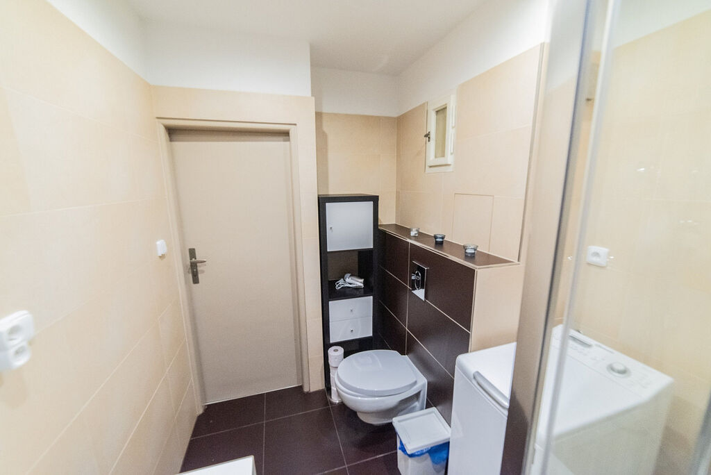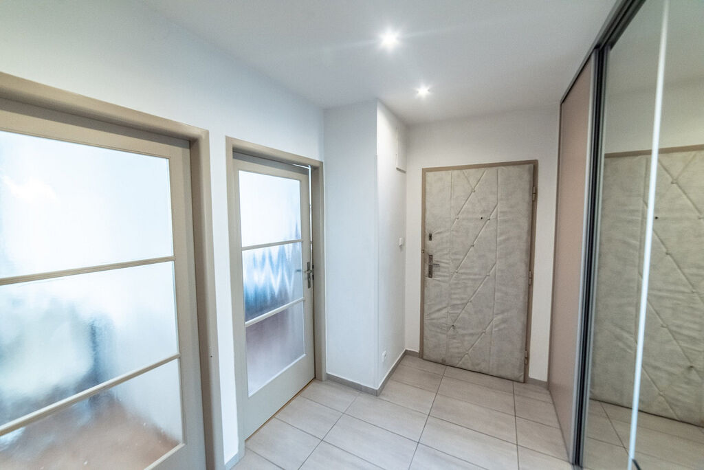 Obývací pokoj s kuchyňským koutem, prostorná předsíň s vestavěnými skříněmi a ložnice se vstupem na balkón a výhledem do klidného vnitrobloku. Koupelna se sprchovým koutem a WC.