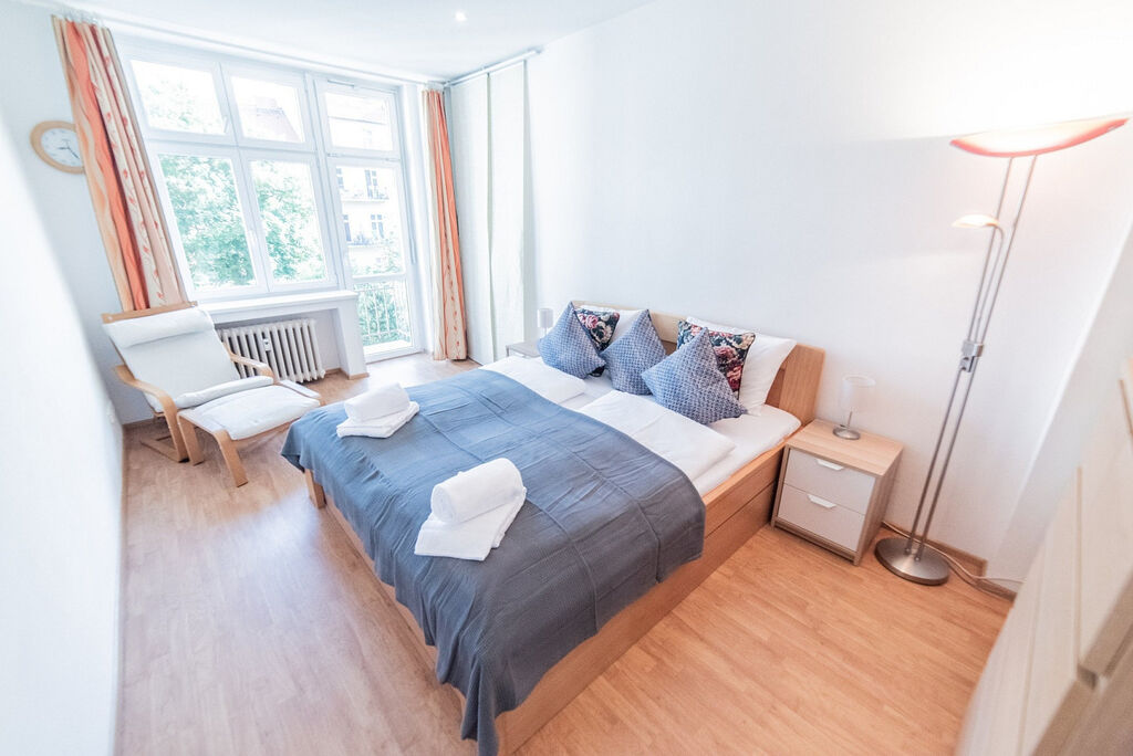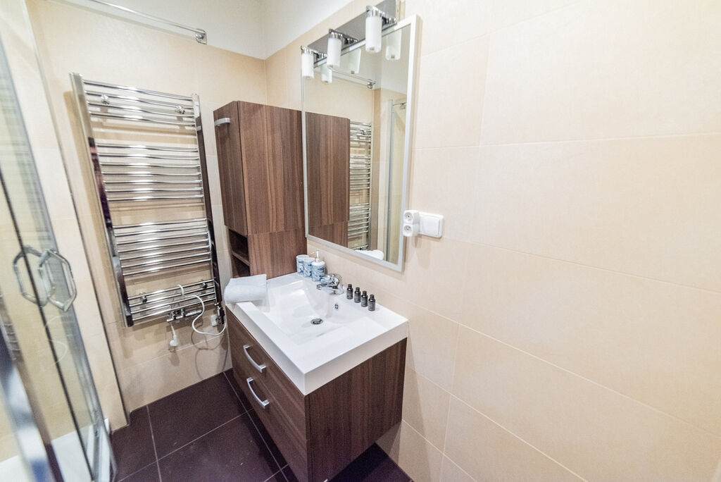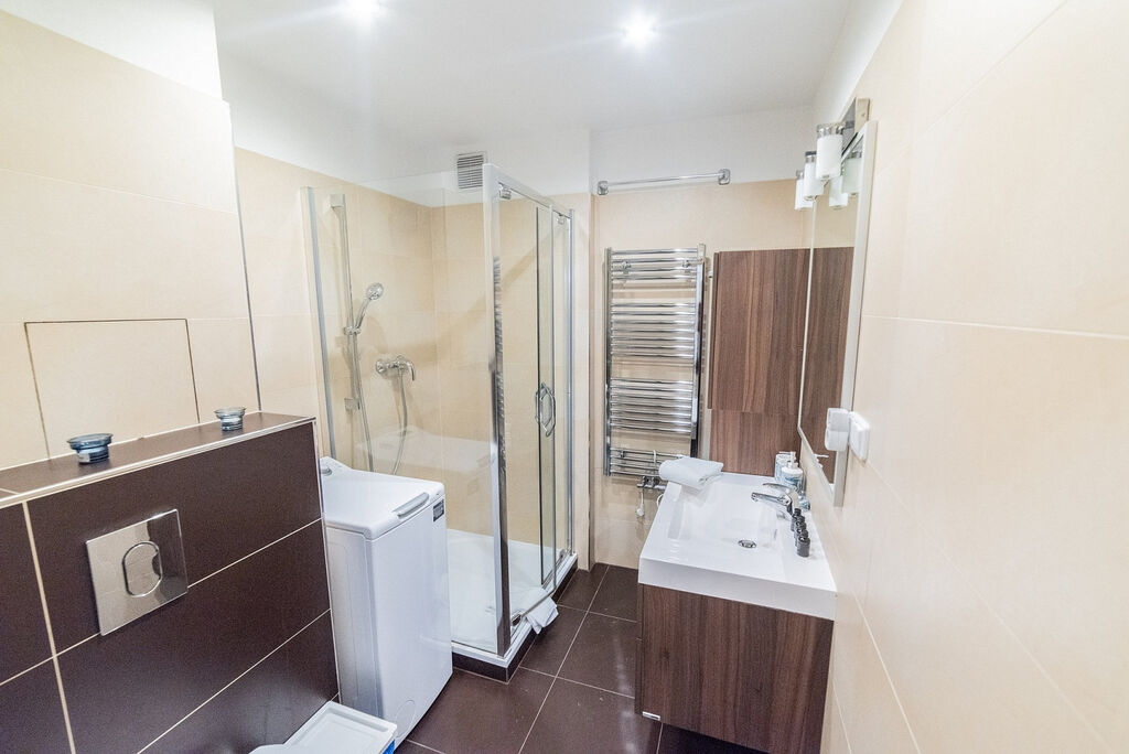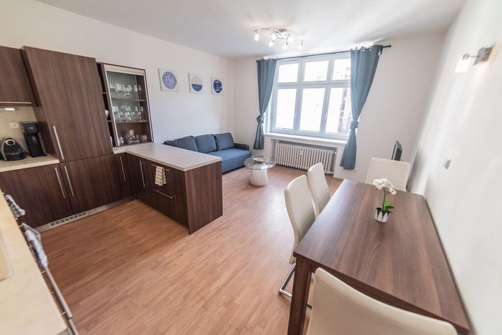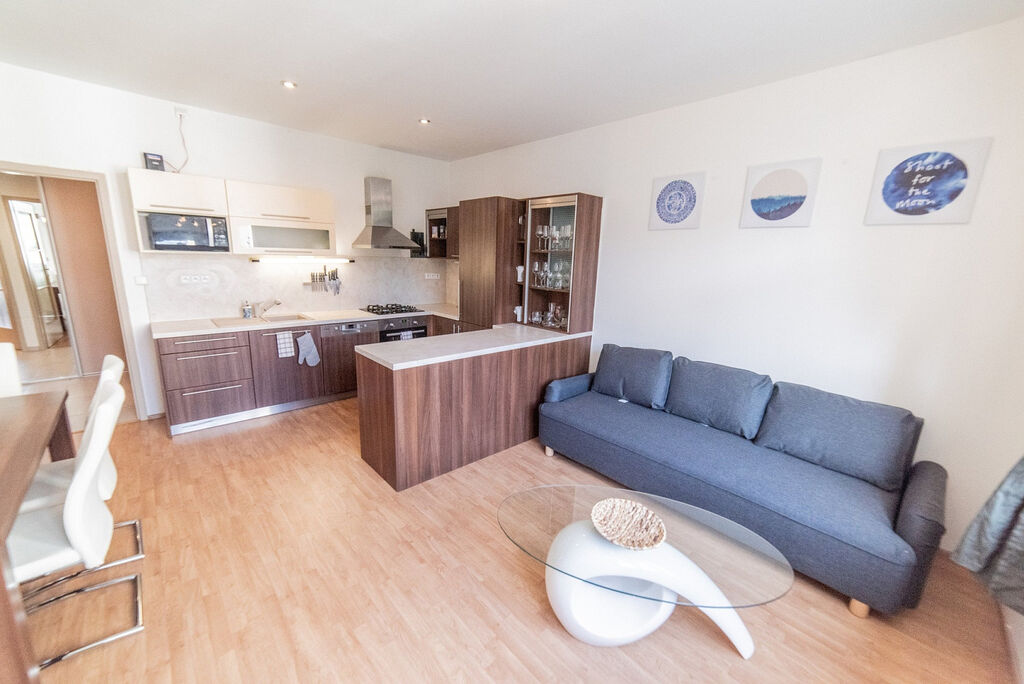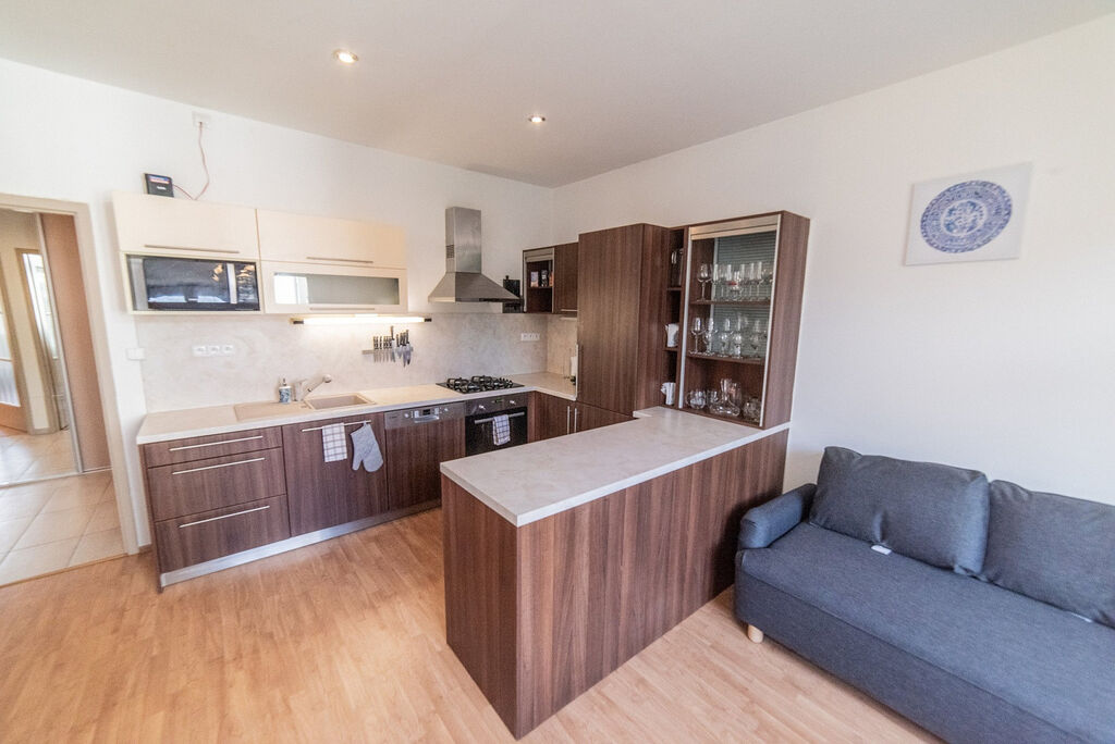 Součástí vybavení bytu je veškerý nábytek včetně postele, rozkládací sedačky a spotřebičů (pračka, myčka nádobí, lednice s mrazákem, plynový sporák, elektrická trouba, digestoř, mikrovlnná trouba).