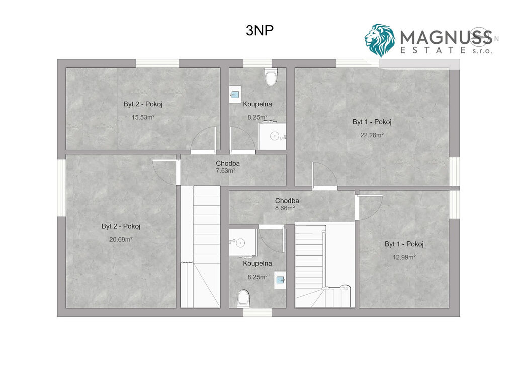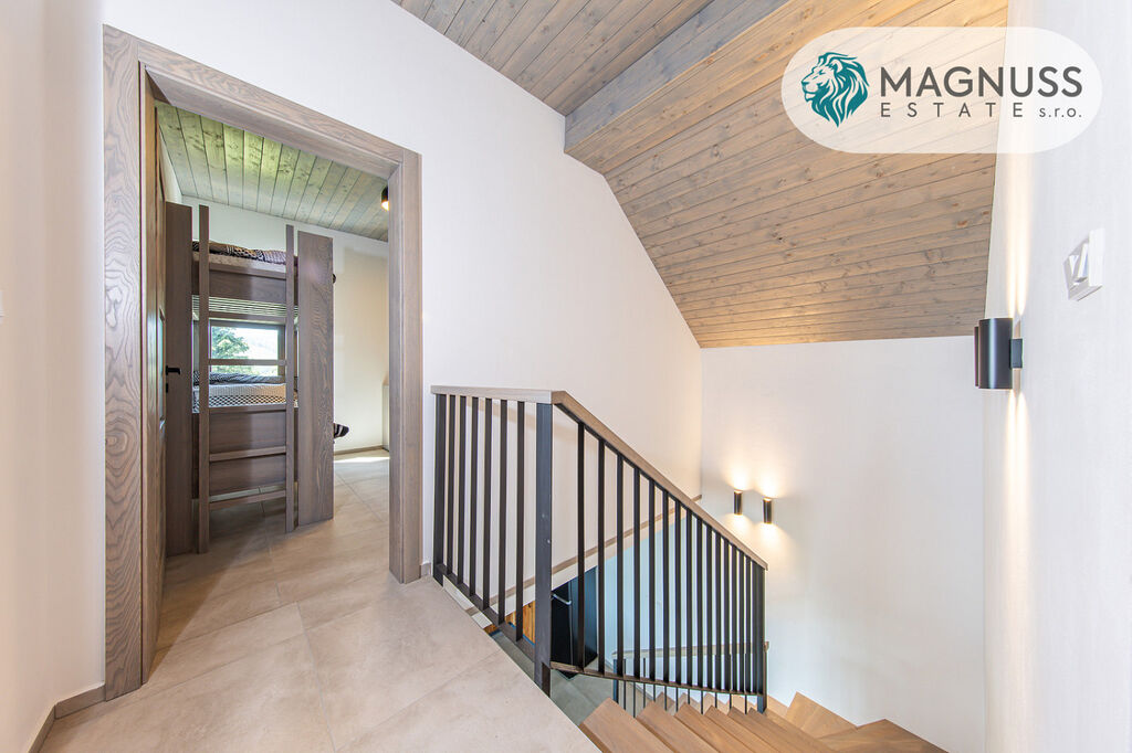 Ve druhém nadzemním podlaží se vstupuje do společné chodby, z níž vedou samostatné vstupy do dvou identických apartmánů. Každý z nich má vlastní měření energií a je plně vybaven a připraven k okamžitému užívání. Hlavní prostor tvoří obývací pokoj s kuchyňským koutem a jídelní částí, ze kterého je přímý vstup na terasu. Ta je orientovaná na východ a nabízí ničím nerušený výhled do otevřené krajiny.
