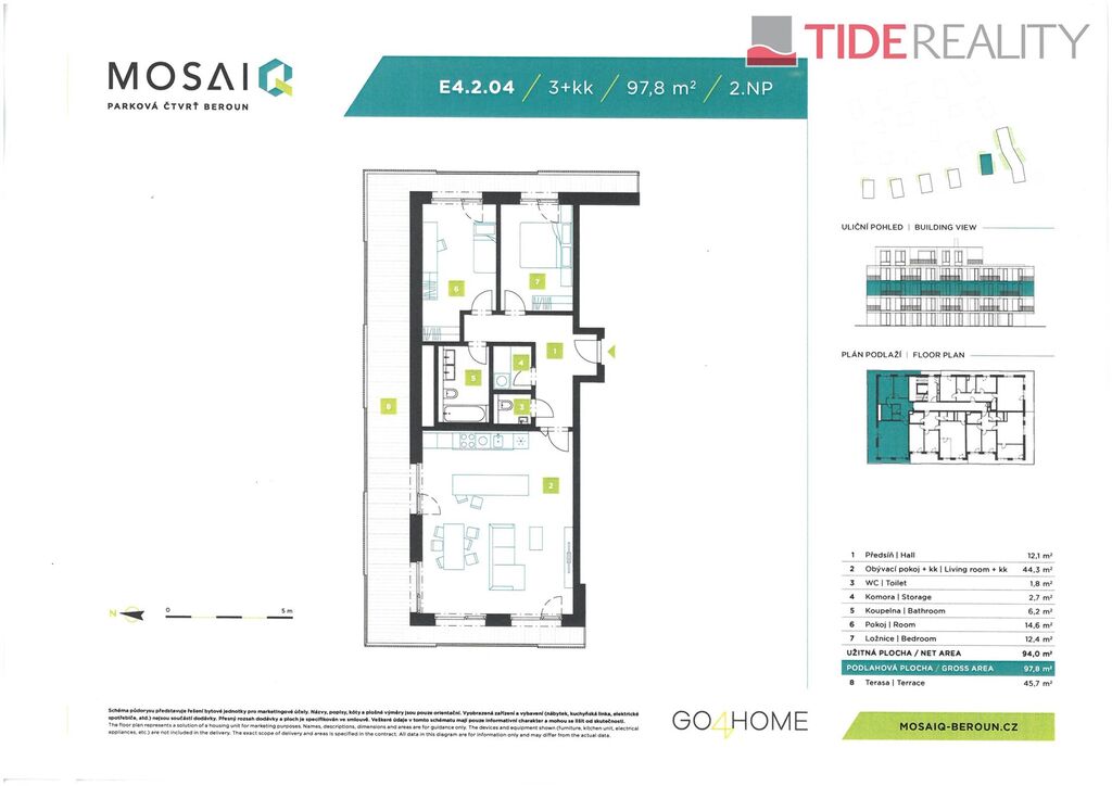 Tento prostorný byt 3+kk o podlahové ploše 97,8m2 s terasou 46m2 přístupnou ze všech pokojů a obíhající kolem celého bytu se nachází ve 2.NP ( 3. podlaží nad terénem) čtyřpodlažní budovy E4. K bytu si můžete přikoupit až 2 vnitřní garážová stání a sklep (není zahrnuto v ceně). V celém projektu je velký výběr bytů 3,4,5+kk v rozmezí 88 až 120m2 i ve vyšších patrech a s prostornými terasami. V současné chvíli je možné jednotky přizpůsobit i některým specifickým požadavkům, proto mne neváhejte kontaktovat.