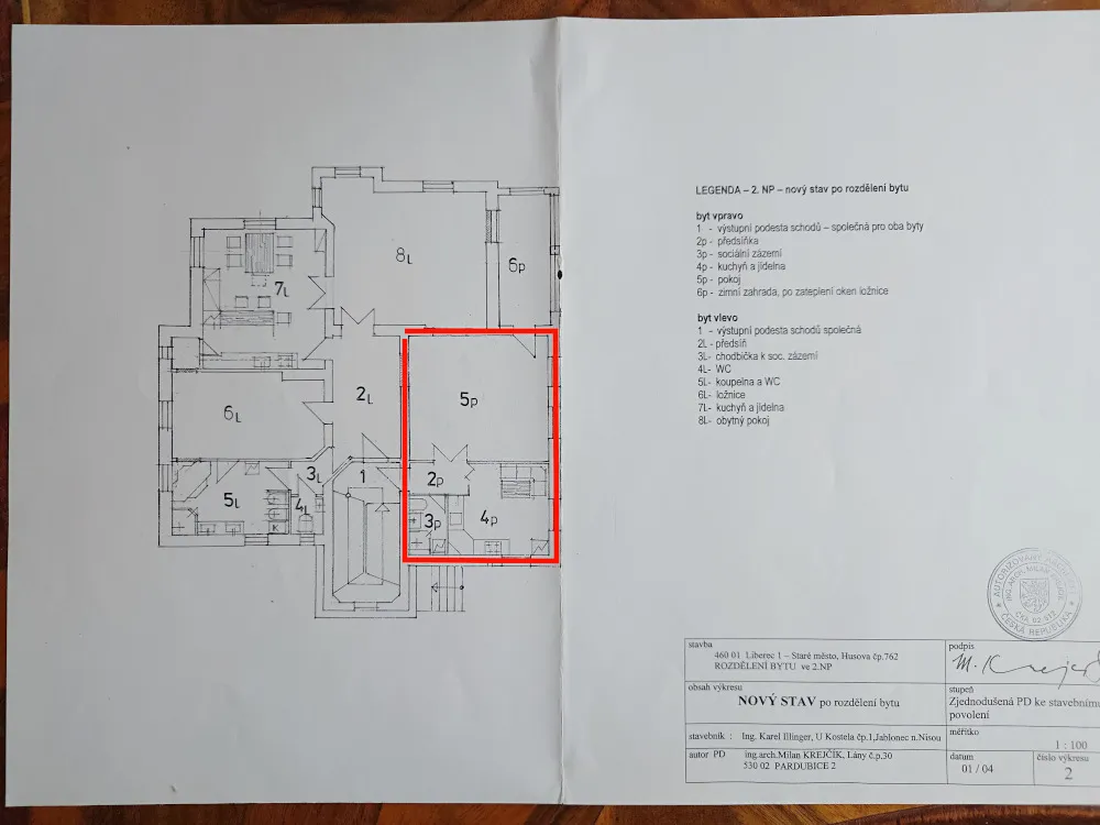 Samotný byt se nachází ve druhém nadzemním podlaží a jeho okna jsou orientována do ulice Husova. Byt prošel postupnou rekonstrukcí – elektřina – cca 10 let zpět, nový plynový kotel a rozvody tepla, vody, zaveden optický kabel a kabelová TV, výměna oken – kopie původních oken, trojskla, cca 3 roky zpětně.