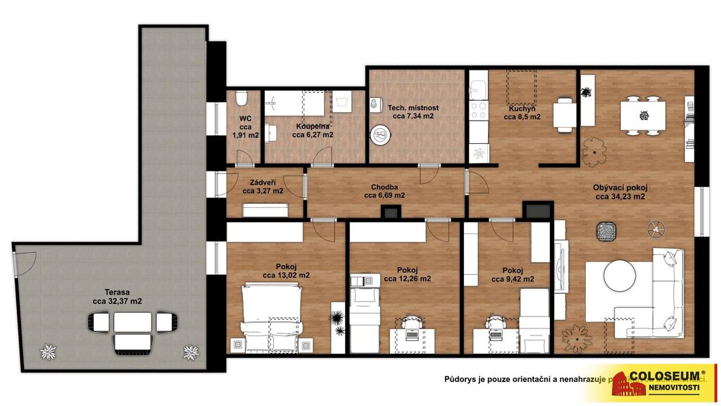 - Obývací pokoj cca 34,2 m² s jídelním koutem.