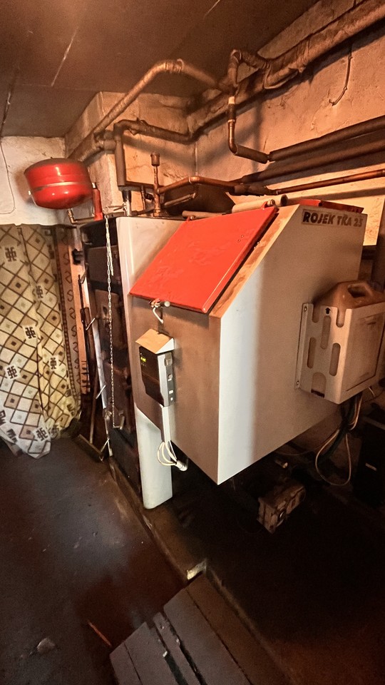 V zadní části přízemí je umístěn automatický kotel na tuhá paliva se zásobníkem. Odpad je řešen pomocí septiku.