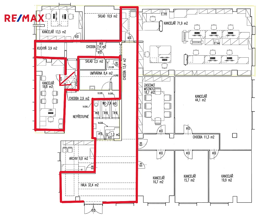 Kancelář není vybavena nábytkem. Společná kuchyňka s WC. K dispozici je možnost pronajmout si více kanceláří najednou, které se nacházejí na stejném patře.