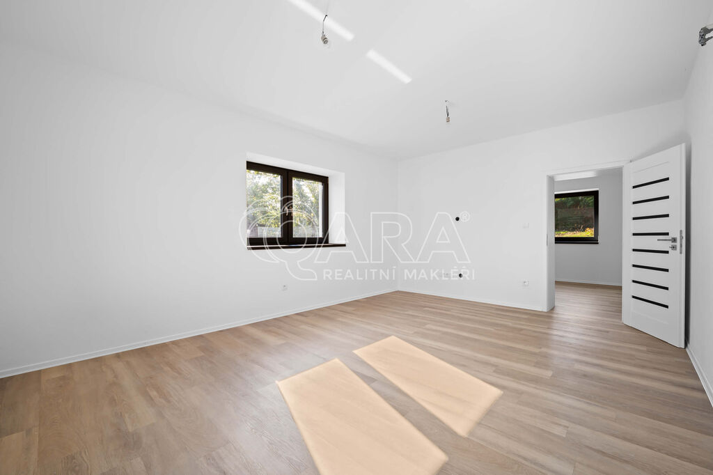 Na podlahách byla položena vinylová podlaha v kombinaci s dlažbou a byly dodány veškeré zařizovací předměty do koupelen a na WC, dále pak dveře včetně obložek. Jinak je dům nevybaven.