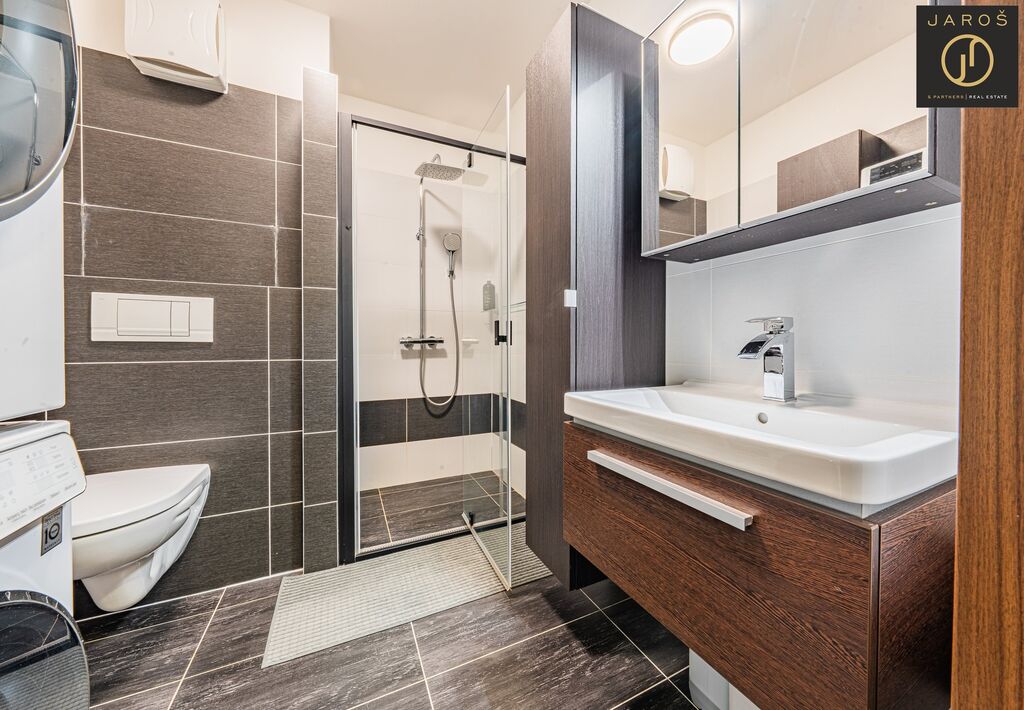 Po vstupu do bytu vás přivítá prostorná chodba, odkud se vchází do moderní koupelny se sprchovým koutem, umyvadlem, toaletou a místem pro pračku i sušičku. Vpravo se nachází obývací pokoj s kuchyňským koutem, ze kterého je vstup na zastřešený balkon, a dále ložnice a další pokoj vhodný jako dětský pokoj či pracovna. Byt působí velmi světlým a útulným dojmem.