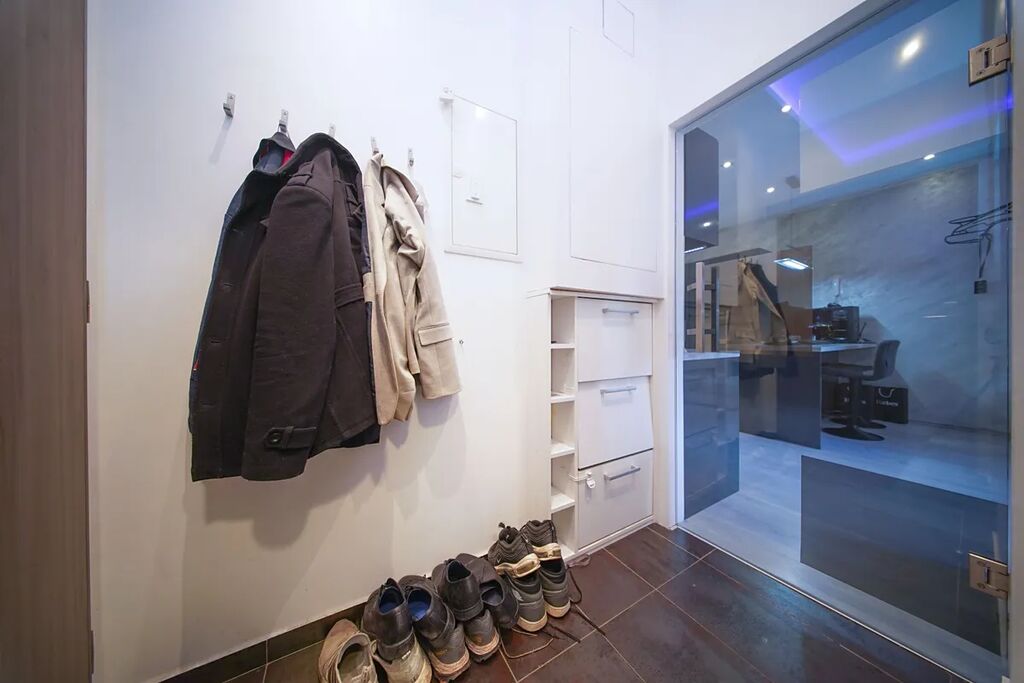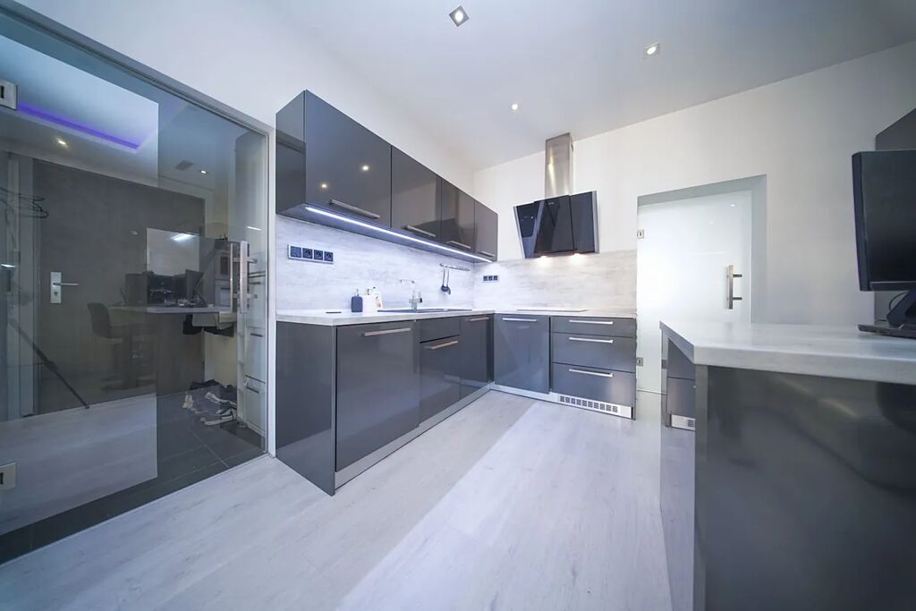 Vysoké stropy (284 cm) se sádrokartonovými podhledy s bodovým osvětlením a s dálkově ovládaným barevným led podsvícením.