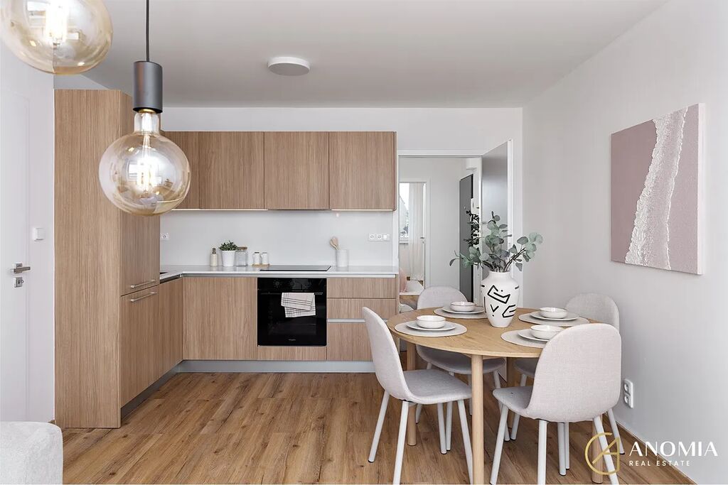 Dominantou bytu je světlý obývací prostor s kuchyní a jídelnou, ze kterého je přímý výstup na prostorný balkon. Kuchyňská linka Spagnol Maryland byla vyrobena na míru s důrazem na kvalitu zpracování a nadčasový vzhled. Součástí kuchyně je kamenná pracovní deska LUNAR WHITE s tloušťkou 2 cm, která svým elegantním povrchem podtrhuje čistý a moderní charakter interiéru. Kuchyň je plně vybavena vestavěnými spotřebiči značek Whirlpool, Indesit a Blanco.