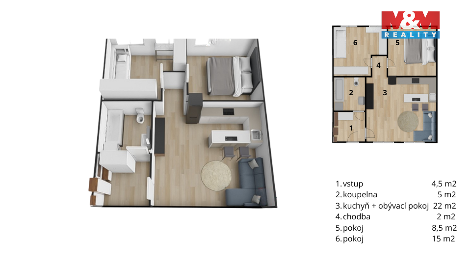 Dispozice nabízí obývací pokoj s kuchyňským koutem, dva neprůchozí pokoje a koupelnu s vanou, sprchou a přípravou na pračku. Všechny místnosti jsou světlé a působí velmi příjemně díky modernímu designu a kvalitním materiálům.