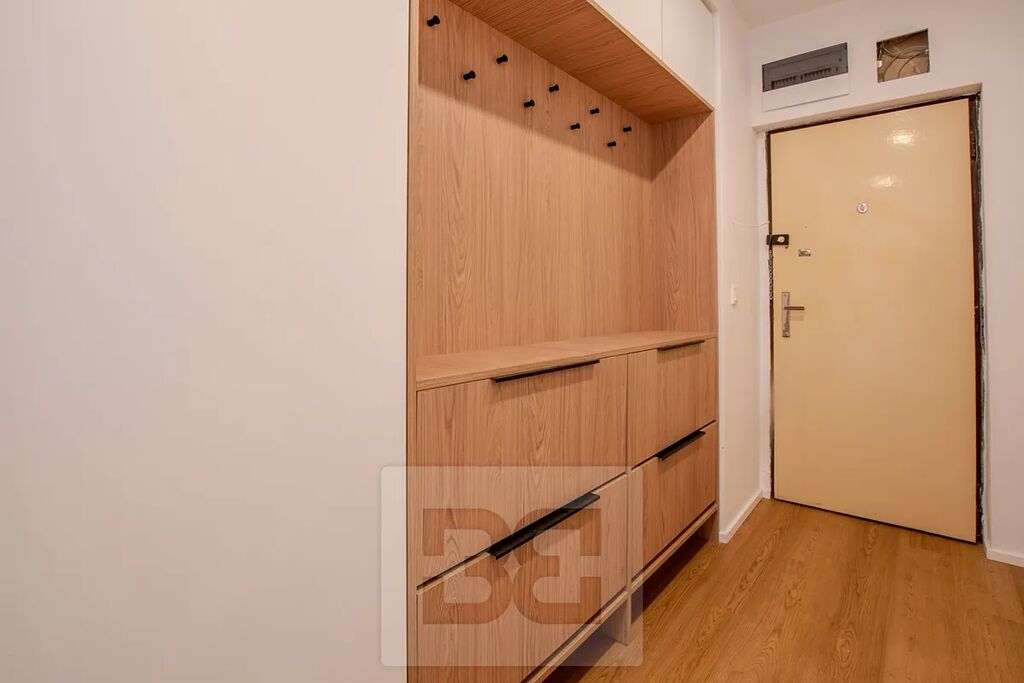 Dispozici tvoří vstupní předsíň s vestavěnou skříní, obývací pokoj propojený s prostornou a moderní kuchyní, která je plně vybavena spotřebiči. Ložnice je samostatná a prázdná orientovaná do vnitrobloku. Koupelna je vybavena sprchovým koutem, toaleta je řešena odděleně. Velkou výhodou je praktická a prostorná komora přímo v bytě.