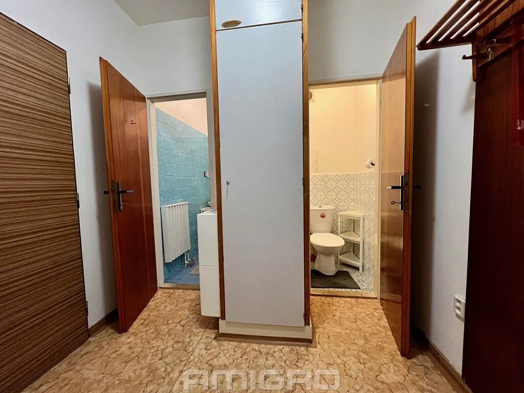 Byt se k pronájmu nabízí zařízen kuchyňskou linkou, sporákem, lednicí, pračkou, vest. skříně v předsíni i šatně.