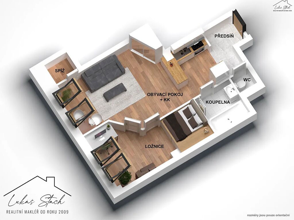 Samotný byt působí díky otevřené dispozici a čtyřem střešním oknům světlým a vzdušným dojmem. Výhodou je nečekaně velkorysé množství úložných prostor – kromě vestavěných skříní a prostoru pod spacím patrem zde najdete i dostatečně velkou komoru, kam pohodlně uložíte sezónní věci, kufry, krabice nebo třeba jízdní kolo. Praktickým řešením je i samostatná koupelna a toaleta. K bytu náleží také lodžie, přístupná ze společné chodby, sdílená jen se dvěma dalšími byty na patře.