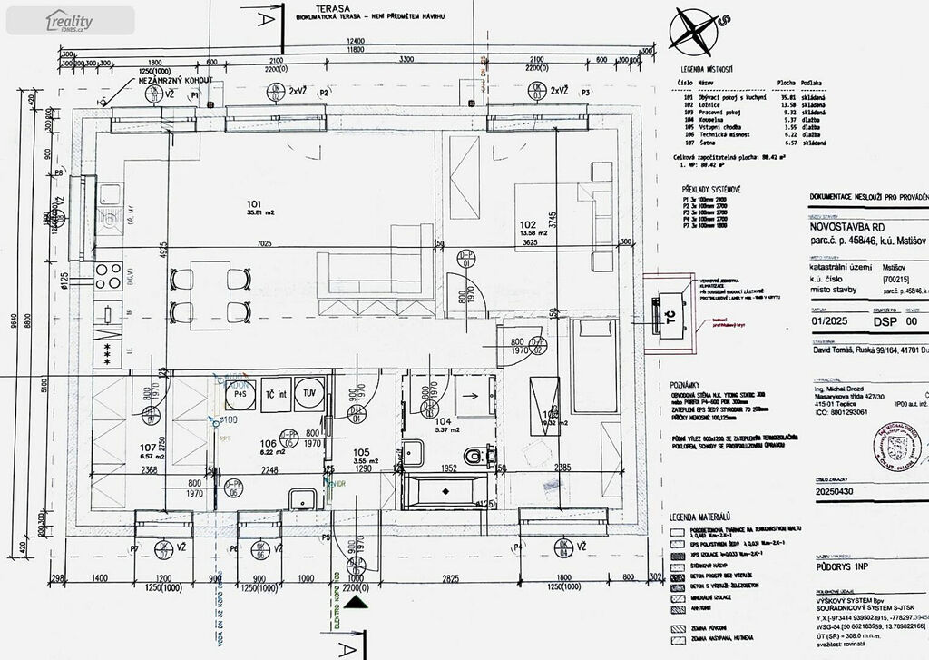 Inženýrské sítě jsou připraveny k okamžitému napojení – elektroměr již osazen a vodoměr je již zapojený. K pozemku je vydáno stavební povolení na novostavbu rodinného domu 3+kk o velikosti 80,42 m². Lze v případě z šatny udělat menší pokoj a tím bude dispozice 4+kk. Součástí bude kompletní projektová dokumentace.