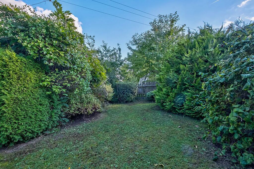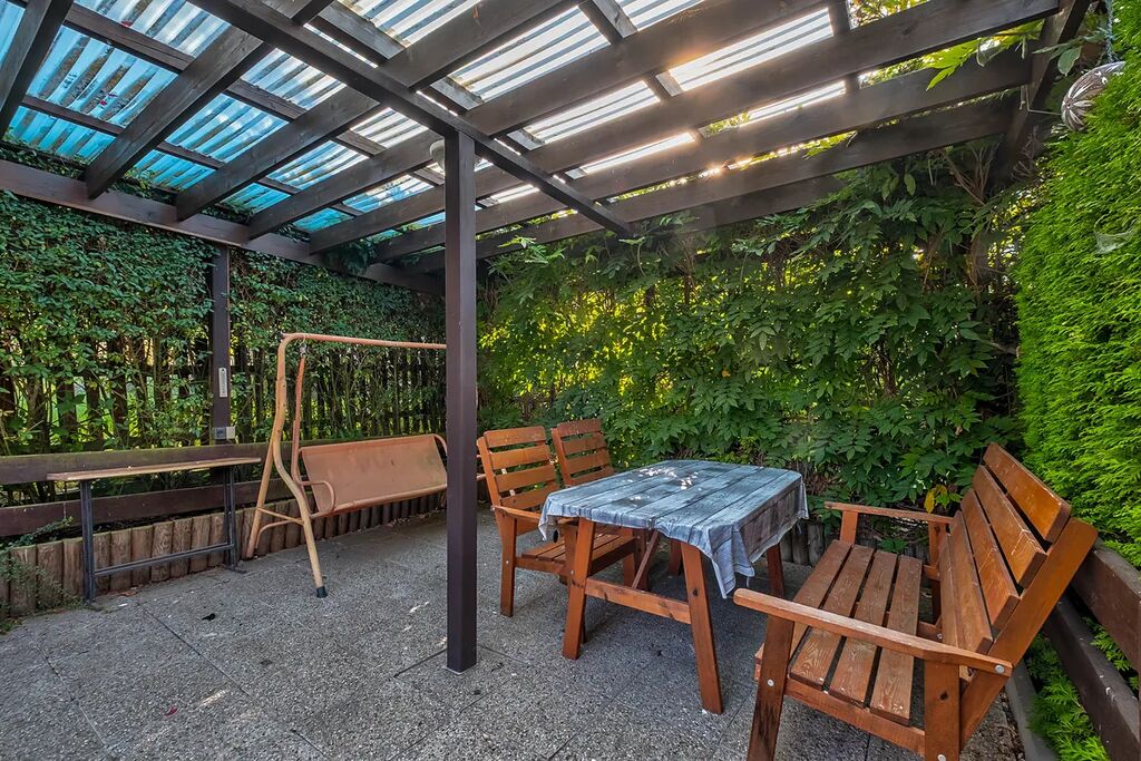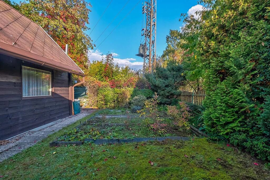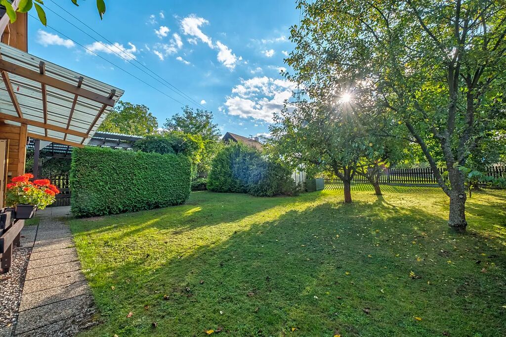Zahrada je osázena vzrostlými ovocnými stromy a ořešákem. Jsou zde vybudovány záhony pro pěstování zeleniny a k dispozici je také skleník. Dešťová voda na zalévání je zadržovaná v akumulačních nádržích. K posezení slouží zastřešená pergola.
