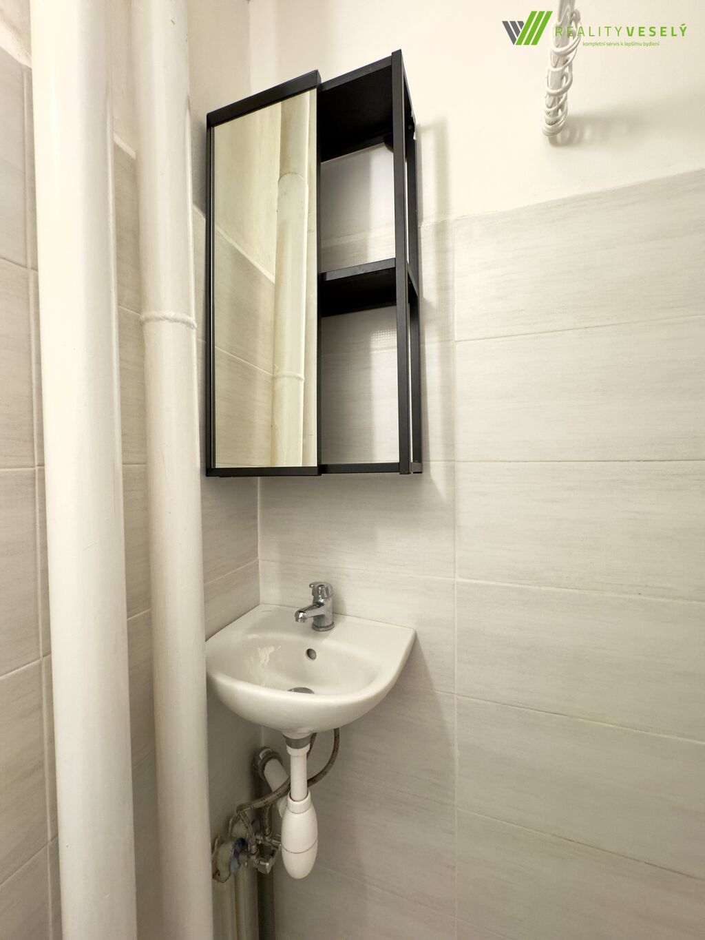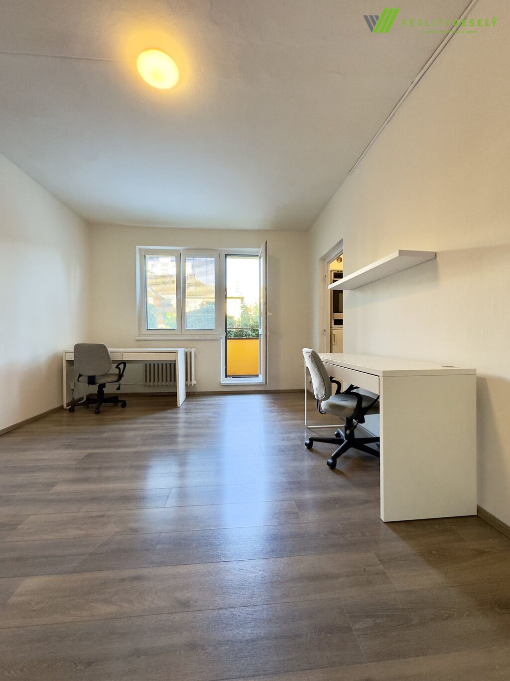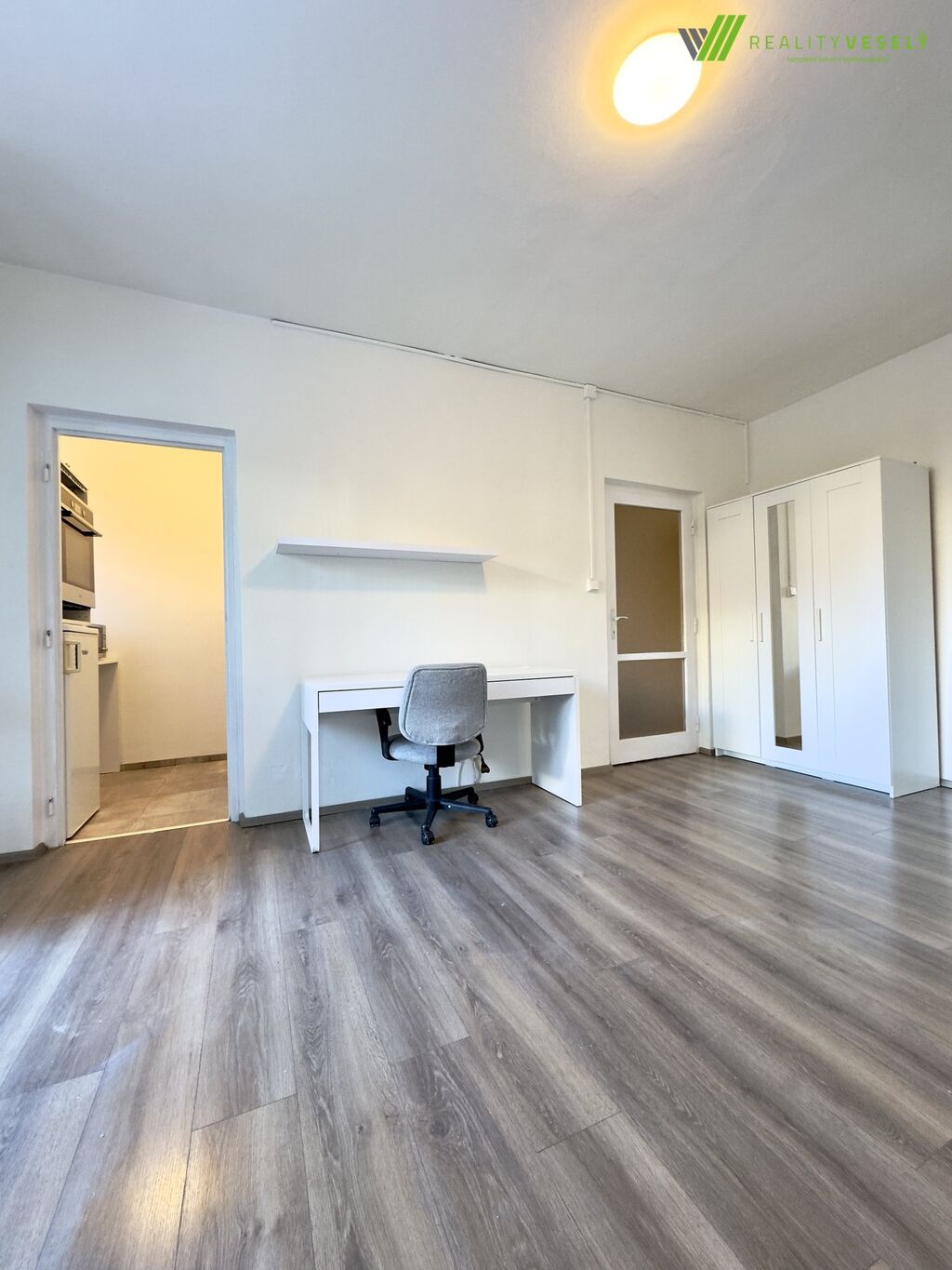 Byt disponuje vstupní chodbou, ze které se vchází do koupelny se sprchovým koutem, umyvadlem a toaletou. Z chodby je dále přístupný obývací pokoj (ložnice) s výstupem na balkon. Součástí vybavení pokoje jsou dva psací stoly, šatní skříň a jednolůžková postel bez matrace. Na pokoj navazuje menší kuchyně vybavená kuchyňskou linkou s varnou deskou, mikrovlnnou troubou, pečicí troubou a lednicí. Je zde také příprava na umístění pračky.