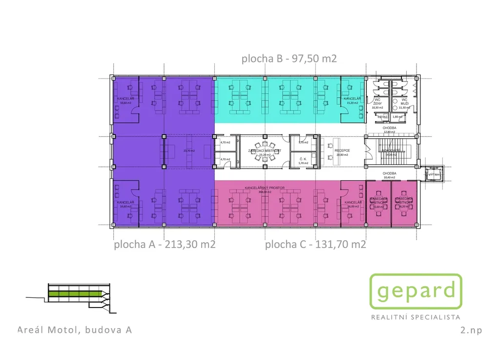 Nabízený prostor o rozloze 131,70 m2 zaujímá část 2. nadzemního podlaží jedné z hlavních budov komplexu. Dispozice je uvedena v přiloženém půdorysu (plocha C). Vybavení je znázorněno na fotografiích. Nájemce může využívat společné prostory: zasedací místnost (23,20 m2), kuchyňku (5,70 m2), toalety (34,90 m2). Poplatek za využívání společných prostor činí 8.655,- Kč. Dále je možné pronajmout sklady (2x4,3 m2 a 1x5,70 m2) za stejnou cenu na m2 jako kanceláře a parkovací stání za poplatek 2.500,- Kč měsíčně za osobní vozidlo. Recepce je v provozu 24 hodin. V komplexu je možné využít konferenční sál (kapacita až 150 míst) a služby restaurace na snídaně a obědy (kapacita až 114 míst) a také služby hotelu.