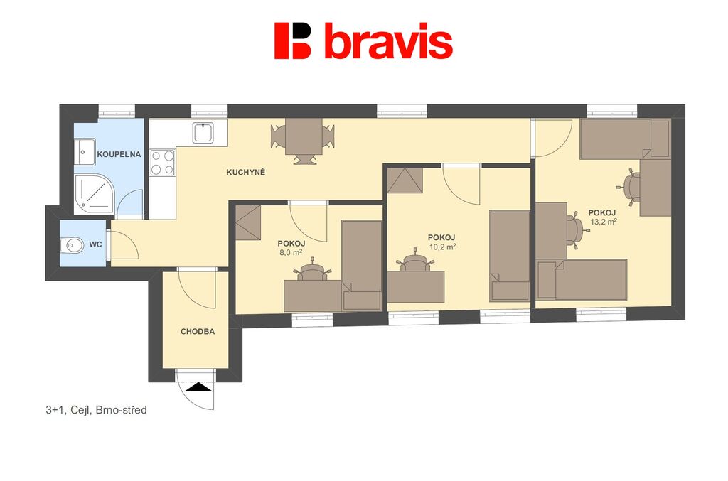 Nabízíme k prodeji bytovou jednotku o dispozici 3+1 a podlahové ploše 59 m², která se nachází ve vnitrobloku domu na ulici Cejl. Velkou výhodou je samostatný vstup přímo z vnitrobloku, což zajišťuje větší soukromí a komfort.