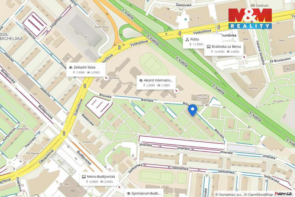 Nabízíme pronájem bytu 3+1 v klidné části Prahy 4 - Michle, v ulici Bítovská. Podlahová plocha bytu je 69 m2. Nachází se ve 4. podlaží panelového domu s výtahem. Dispozice bytu: zádveří, hala, ze které vedou vchody do všech místností, které jsou neprůchozí, kuchyně (kuchyňská linka - kombinovaný sporák, lednice s mrazákem, digestoř, myčka), 3 neprůchozí ložnice, koupelna (sprchový kout, připojení pro pračku, umyvadlo, WC). Vestavěné skříně v hale a dětském pokoji. V pokojích a hale vinylové plovoucí podlahy, v kuchyňském koutě a v koupelně dlažba. K bytu náleží sklep 1 m2. V okolí je veškerá občanská vybavenost. Stanice metra C Budějovická cca 5 min chůze od domu. Volné ihned. Pro bližší informace volejte RK.