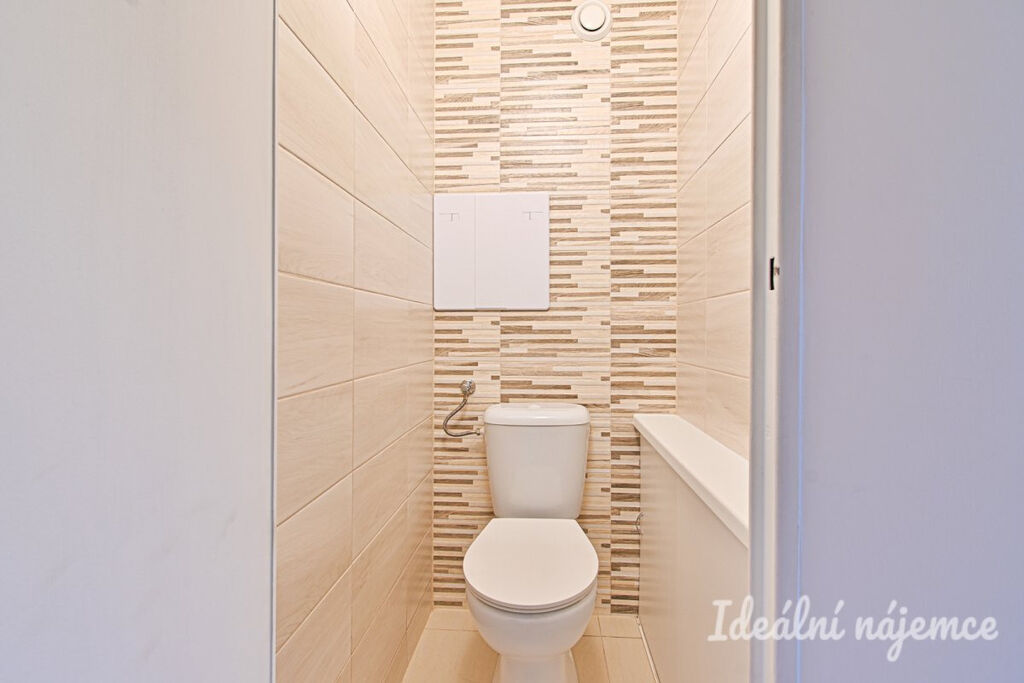 Koupelna je vybavena menší vanou, umyvadlem se skříňkou a pračkou. Toaleta je oddělená.