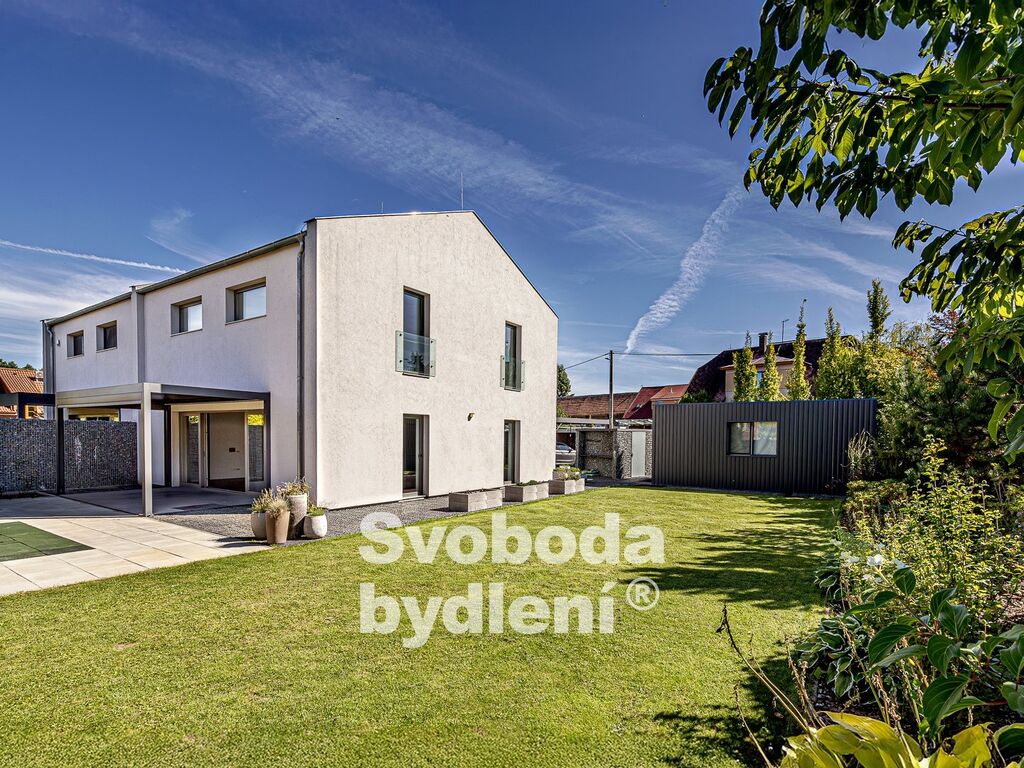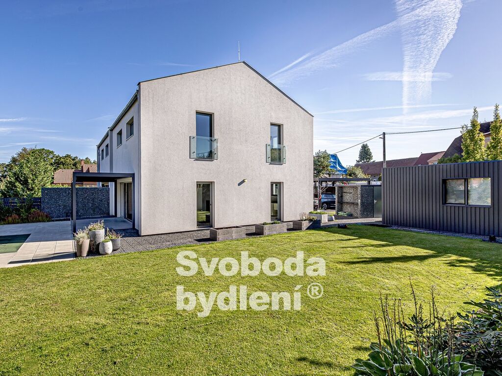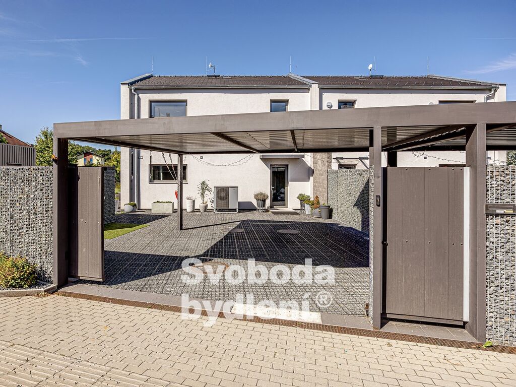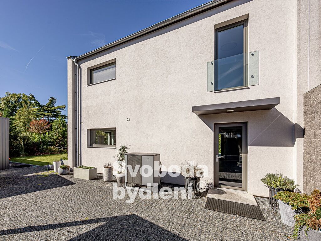 Technické informace: Pozemky celkem 678m2, z toho zastavěná plocha 89m2 + 21m2, užitná plocha domu 161m2. Dům postavený z YTONGu, zatepleno 20cm polystyrenu včetně izolace proti vzniku tepelných mostů, Energetická třída B, střešní krytina Tondach - černá pálená taška, hliníková okna i dveře s izolačním trojsklem, mramorové parapety, zavedena voda, elektřina i kanalizace (plyn není zaveden), vytápění tepelným čerpadlem voda/vzduch s vnitřním modulem (all-in-one) NIBE VVM320, podlahové vytápění v obou podlažích, jednotka v zimě topí a v létě chladí; sanita Villeroy & Boch, vodovodní baterie Hansgrohe, designové osvětlení Catellani&Smith, Artemide a Rendl Studio, Internet/wifi modem; podlahová krytina v 1. NP je velkoformátová (90x90cm) italská dlažba, ve 2. NP plovoucí podlahy; obklady zakončené hliníkovými lištami, všechny interiérové (bezfalcové) dveře mají zapuštěné panty a magnetické jazýčky. Automatická závlaha (kapačka) a robotická sekačka. Na prodej je polovina dvojdomu, domy mají samostatné obvodové zdi a jsou navíc zvukově odděleny polystyrenem. Měsíční náklady na provoz domu jsou cca 5.000,-Kč (elektřina + voda).