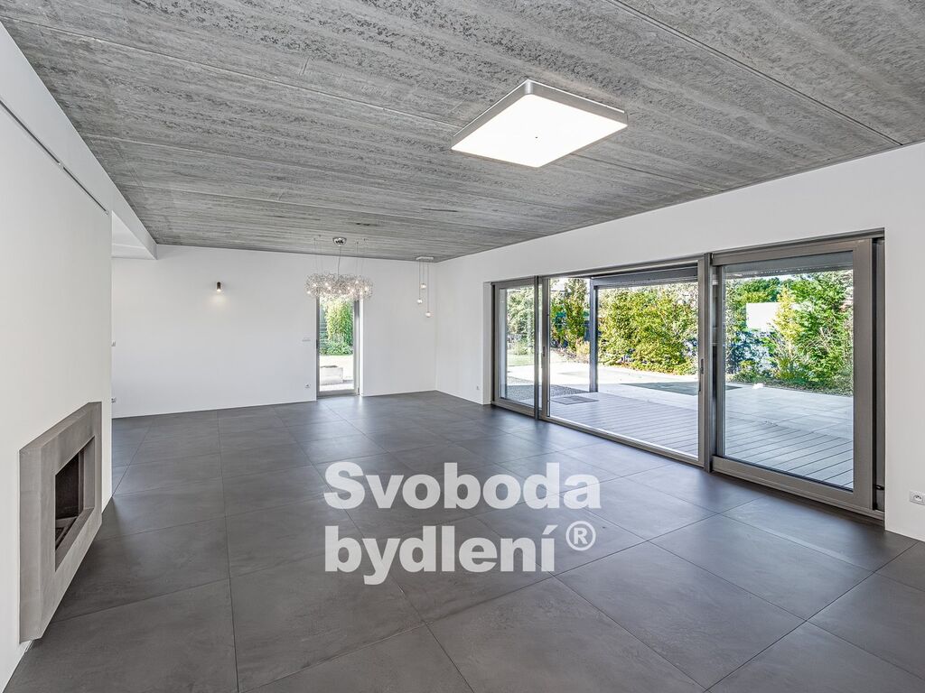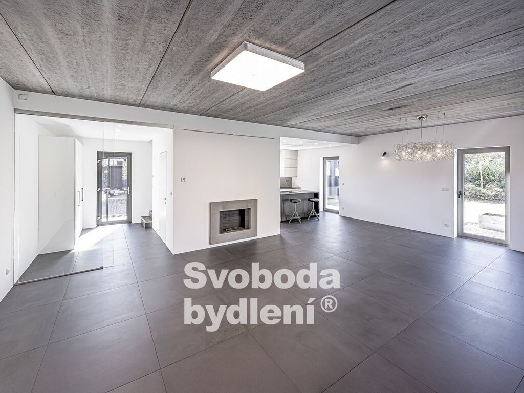 Přestože se jedná o dvojdům (na prodej je pouze levá část domu s výhodnější orientací – J, V, Z), nabízí dostatek dnes tolik potřebného soukromí pro jeho obyvatele. Přitom jeho 1.NP umožní pohostit i početnější skupinu návštěvníků. Velkorysý obývací pokoj s plochou téměř 48m2 a výškou stropu 2,86m (pohledový beton) je největší místností v domě, doslova jeho dominantou. Z něj se vstupuje francouzskými velkoformátovými dvoukřídlými posuvnými dveřmi na klidnou terasu (20m2) s bioklimatickým zastřešením Artosi. Součástí jsou ze dvou stran elektrické vytahovací rolety. Při otevření obou křídel vzniká přirozené propojení obytného prostoru s terasou a navazující zahradou za domem.