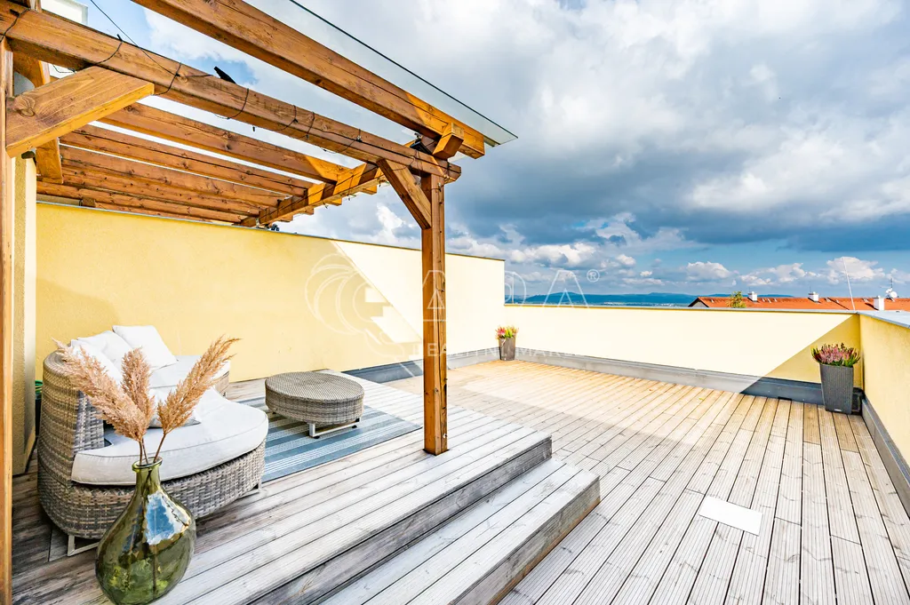 Skvělým bonusem je prostorná terasa s výměrou 37 m² a výhledem na lesopark Dražovka. Povrch tvoří masivní Thermoborovice, nechybí ani pergola se zastřešením z tvrzeného skla, ideální pro relax nebo večerní posezení.