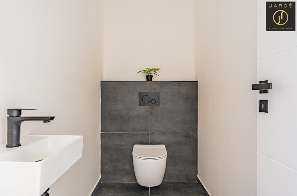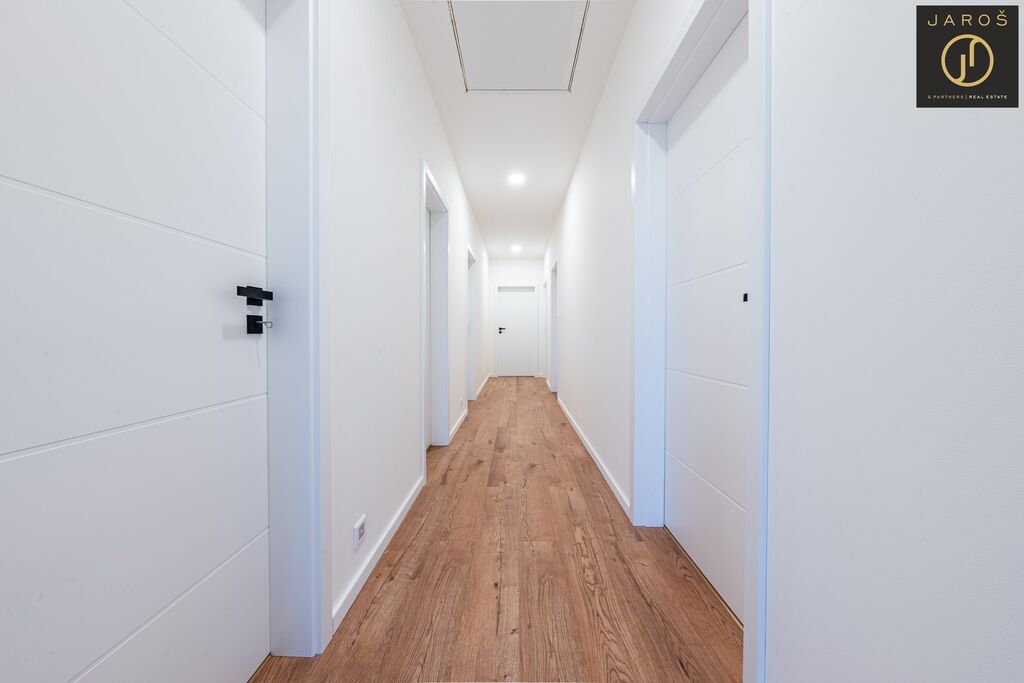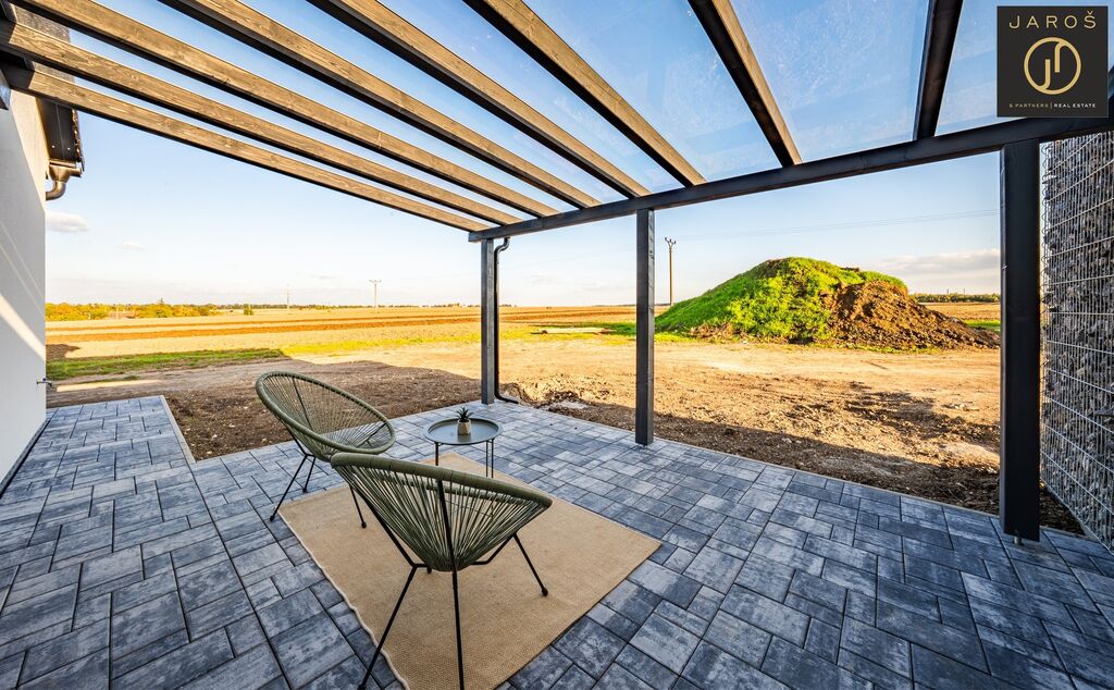 Dům nabízí promyšlenou dispozici a kvalitní zpracování. Interiér tvoří světlý obývací prostor s kuchyní a přímým vstupem na prostornou terasu, tři samostatné pokoje, koupelna s vanou, sprchovým koutem a toaletou, dále samostatné WC. Na podlahách je kombinace plovoucích podlah a dlažby.