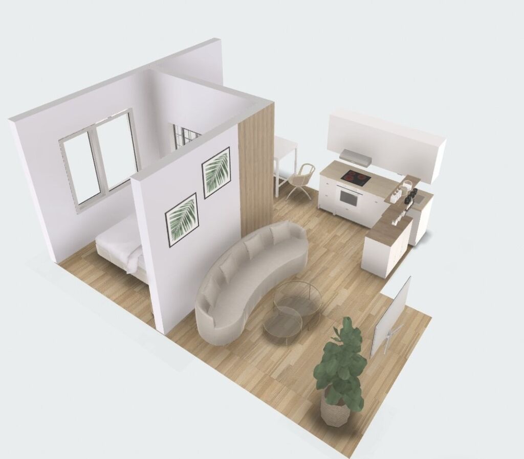 Díky rozmístění oken je možné byt snadno přepažit na dispozici 2+kk (viz ilustrační návrh na posledních fotografiích).