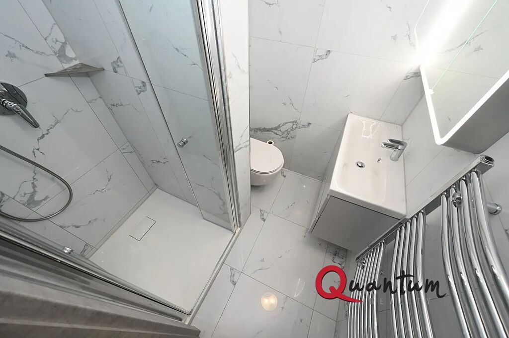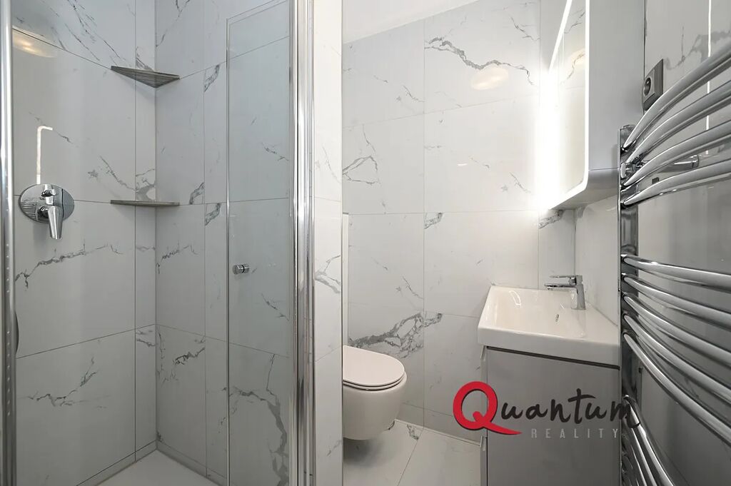 Koupelna je zděná, vybavená sprchovým koutem, toaletou, bidetovou sprškou, topným žebříkem a podlahovým vytápěním. K bytu náleží prostorná lodžie, která je po celé délce bytu a sklepní kóje v suterénu domu.