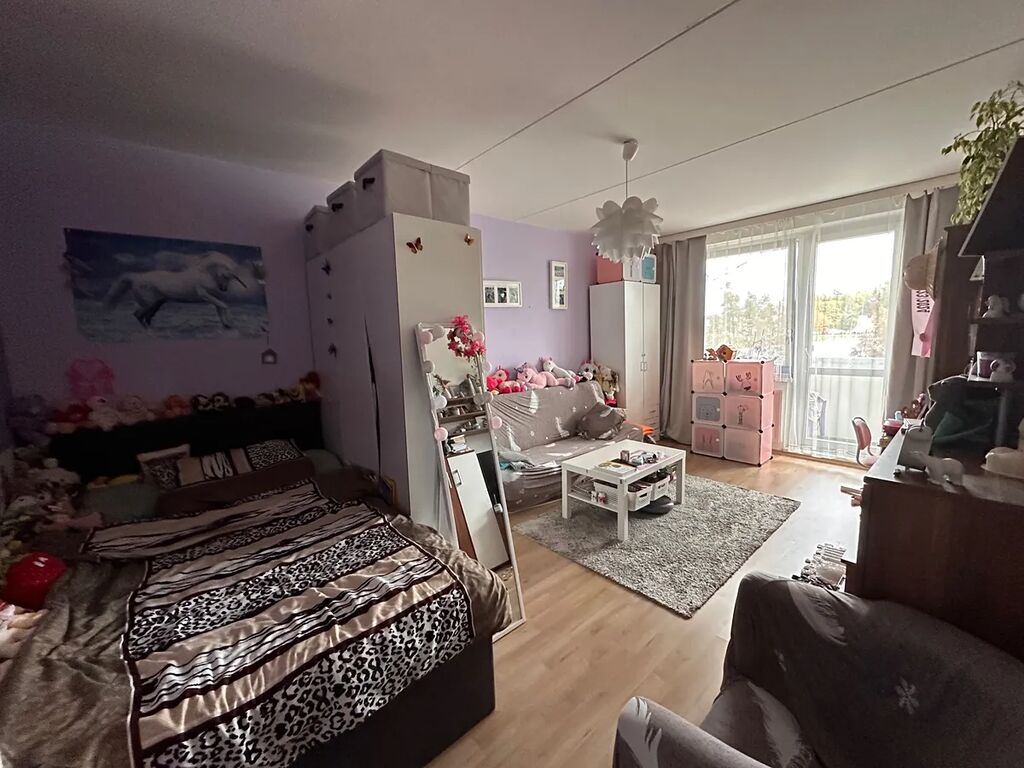 pokoj 19,9m2, kuchyně 9,3m2, koupelna s toaletou 3,6m2, předsíň 4,4m2, šatna 2,4m2, sklep 1,32m2 a balkón 4,8m2.
