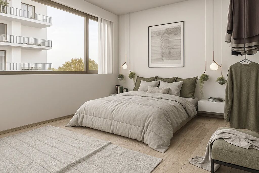 Koupelna je vybavena umyvadlem a prodlouženým sprchovým koutem, WC je samostatné. Hlavním obytným prostorem bytu je obývací pokoj s technickými přípravami pro napojení kuchyňské linky a dostatkem místa pro stolování, s velkými balkonovými dveřmi otevírajícími se na rohový balkón. Byt dále disponuje samostatnou ložnicí o velikosti více než 13 m2. Okna jsou orientována na západ a severozápad.