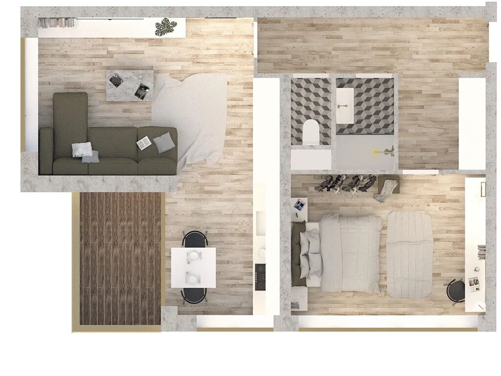 Moderní dvoupokojový byt s plochou 57 m2 a prostorným rohovým balkónem se nachází ve čtvrtém, nejvyšším podlaží bytového domu Rezidence Zlatá Pole a bude připraven k nastěhování ještě v tomto roce.