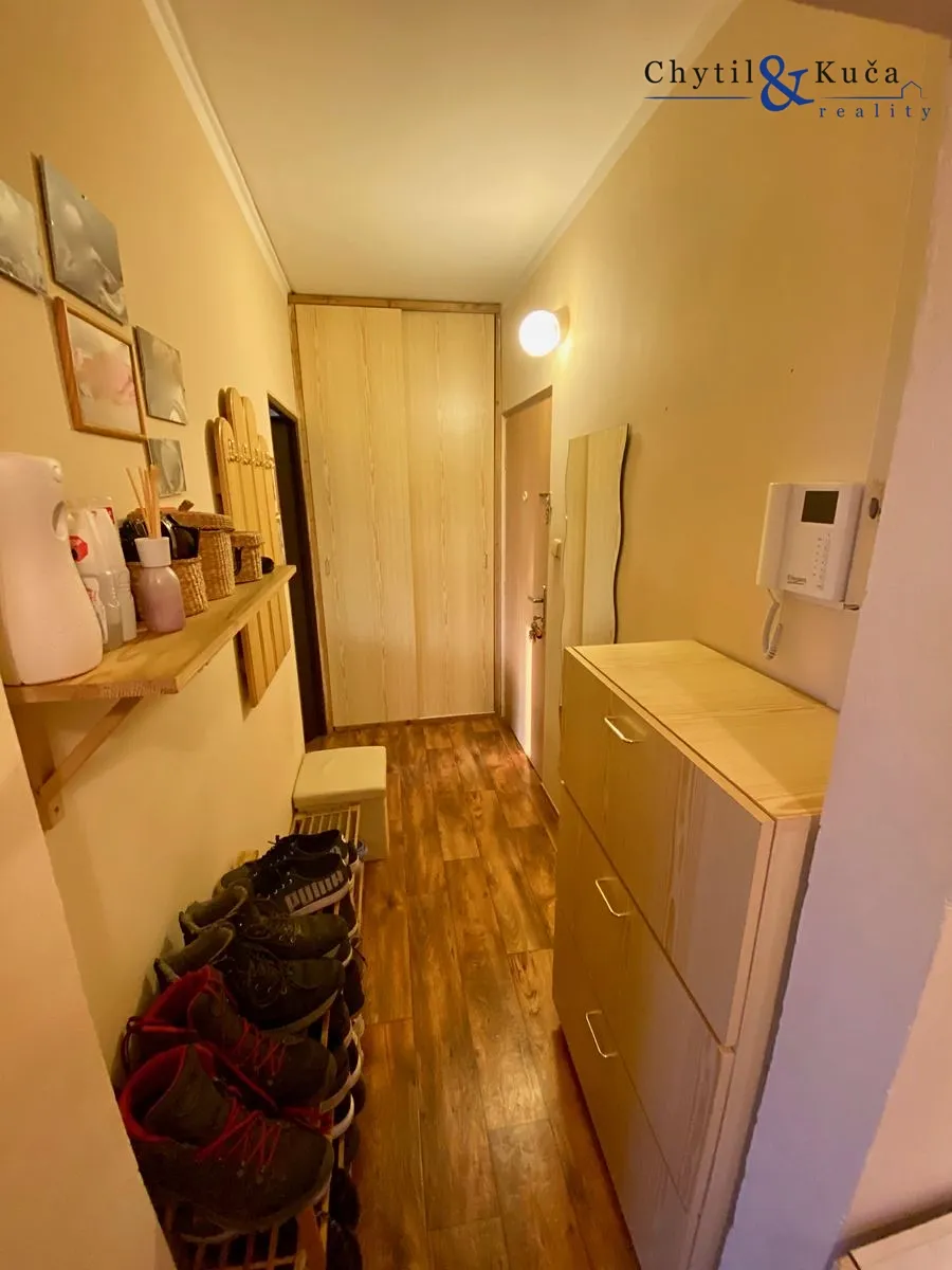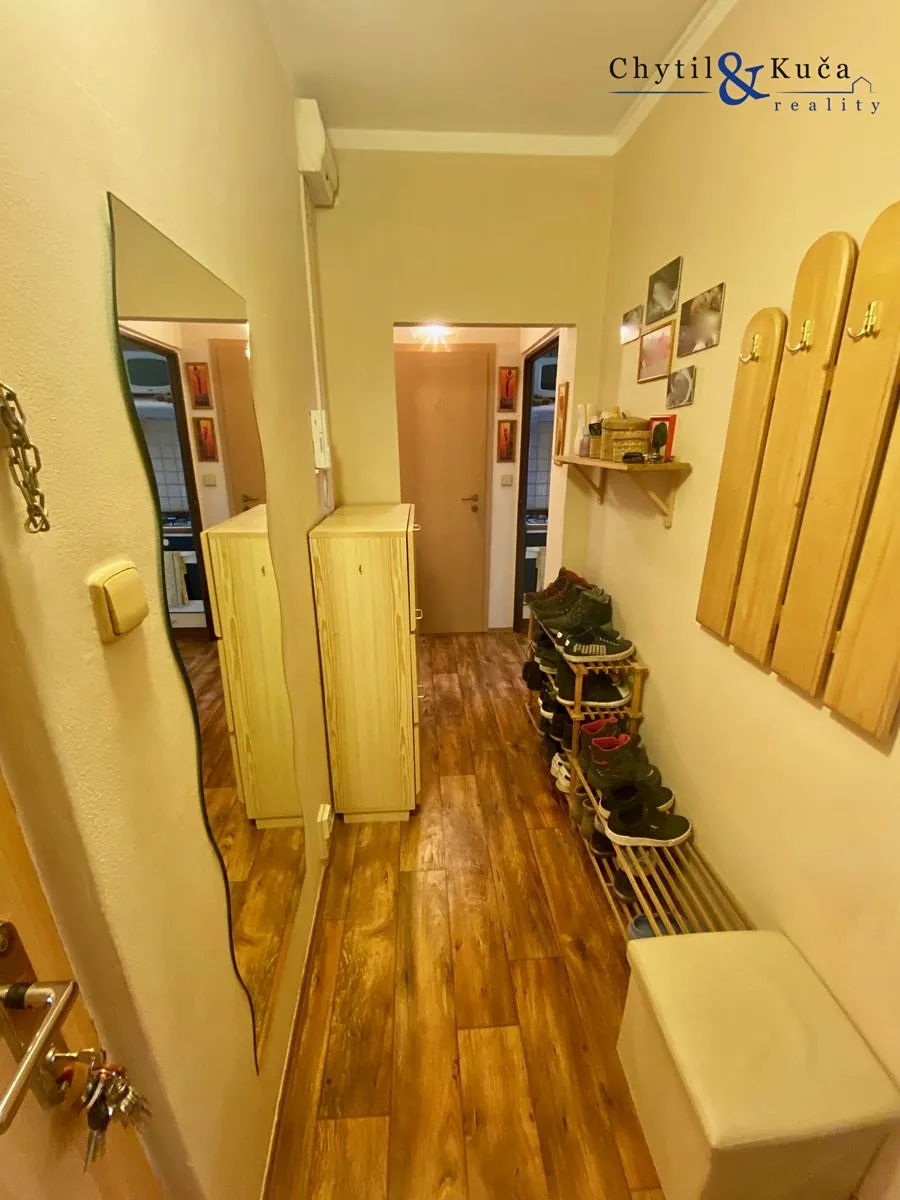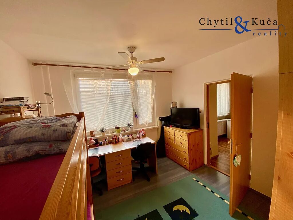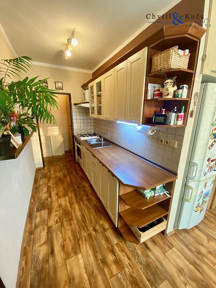 Byt se nachází ve vyvýšeném přízemí a podlahová plocha činí 52 m2. V tomto bytě se nachází chodba, dva pokoje, kuchyně, koupelna a samostatné wc. Byt prošel cca před 12ti lety rekonstrukcí a má zděné jádro. Ikdyž je byt dispozičně vedený jako 2+1, tak obývací pokoj je prakticky vyřešen i jako ložnice a to postelí spuštěnou ze stropu pomocí konstrukce a uzpůsoben tak, aby zde mohla bydlet popř. i 4-členná rodina (doposud ze strany majitelů tak bylo). Součástí bytu je prostorná lodžie a sklepní kóje.