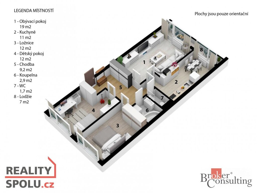 Bytová jednotka disponuje prostornou centrální předsíní, ze které vstoupíte do dalších tří pokojů, kuchyně, koupelny a na samostatnou toaletu.