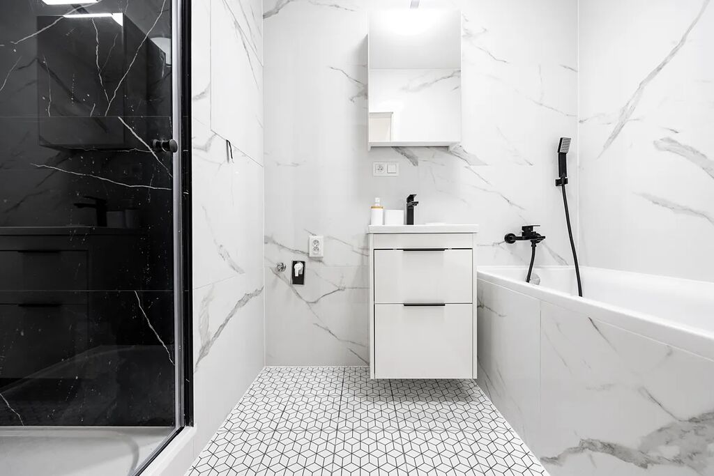 - nová sanita (vana, sprchový kout, umyvadlo, skříňka, toaleta)