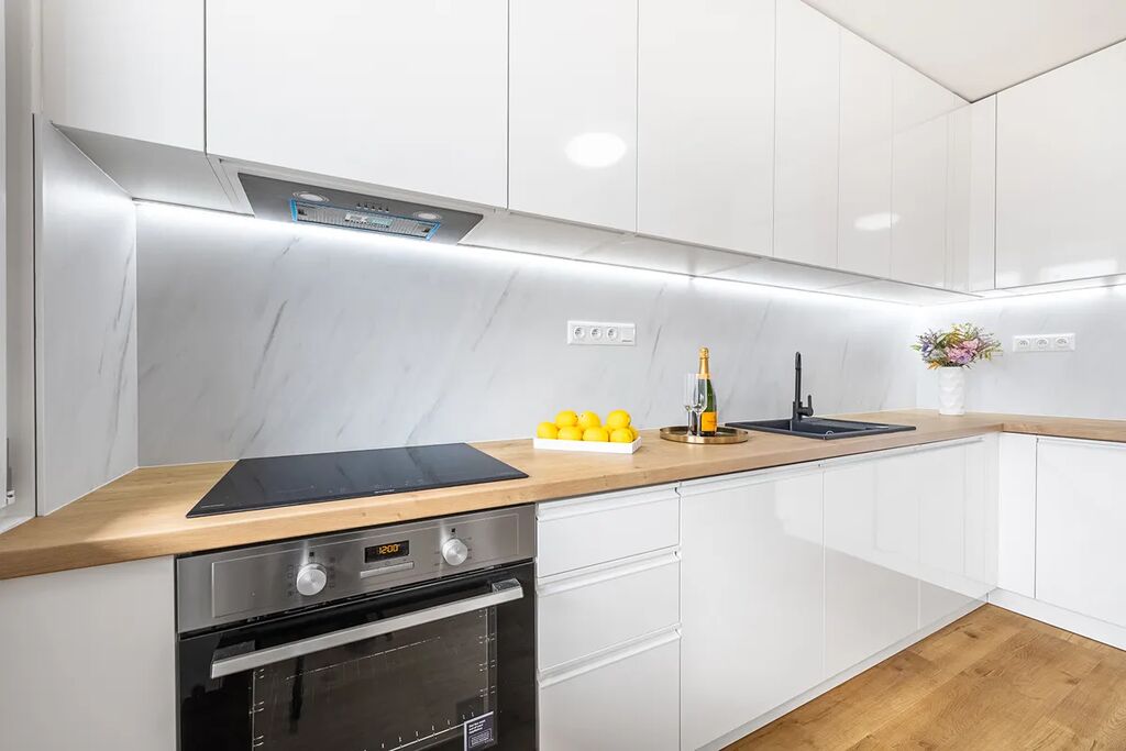 - nová kuchyňská linka vyrobena na míru se spotřebiči (značková elektrická trouba, myčka, indukční deska, digestoř, osvětlení, dřez)