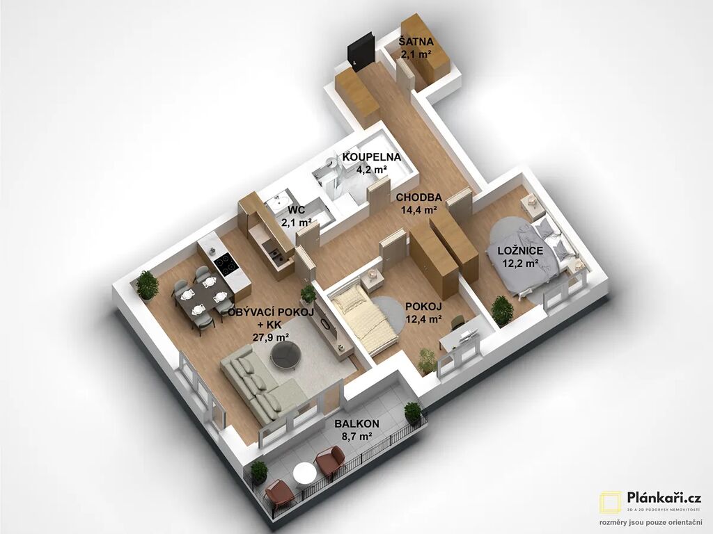 - 2x plnohodnotná ložnice (12,4 m2 + 12,2 m2)