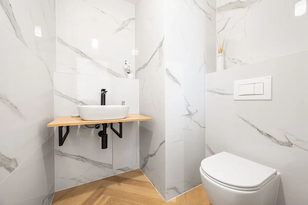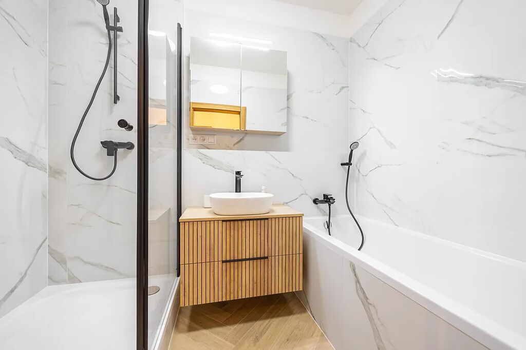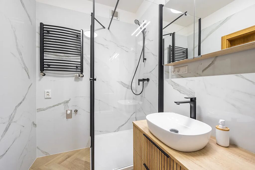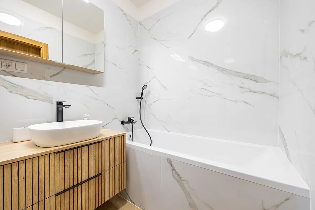 - Koupelna má velkoformátový obklad s dekorem bílého mramoru a podlahu s dlažbou ve vzoru dřeva. Je vybavena vanou, umyvadlem, skříňkou se dvěma zástuvkami, galerkou se zrcadlem a osvětlením, topným žebříkem a podlahovým topením.