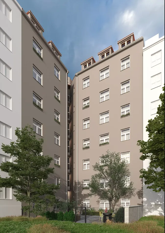 Dům prošel komplexní rekonstrukcí, která zahrnuje novou fasádu, modernizované společné prostory a sklepní kóje. Ve společných prostorách najdete elegantní mramorové obklady, designové osvětlení z broušeného skla, nový prosklený výtah, praktické schránky a bezpečnostní dveře z dubového dřeva. Oprava byla provedena s maximální péčí, aby vydržela na generace. Součástí domu je také klidný dvůr ve vnitrobloku, který slouží jako malá oáza pro společné užívání a relaxaci.