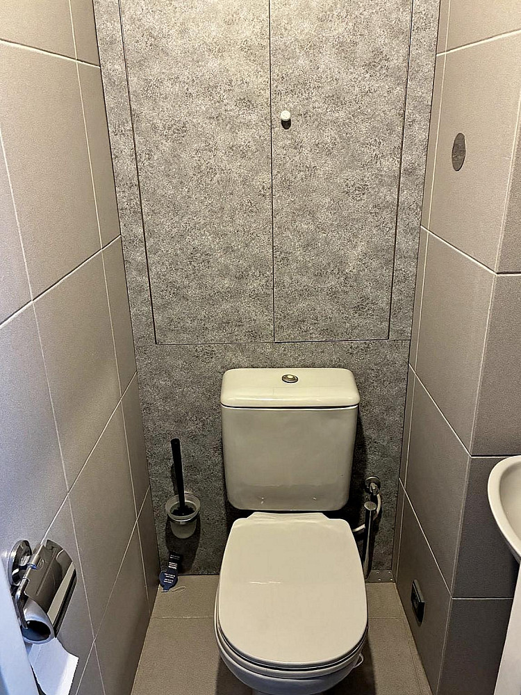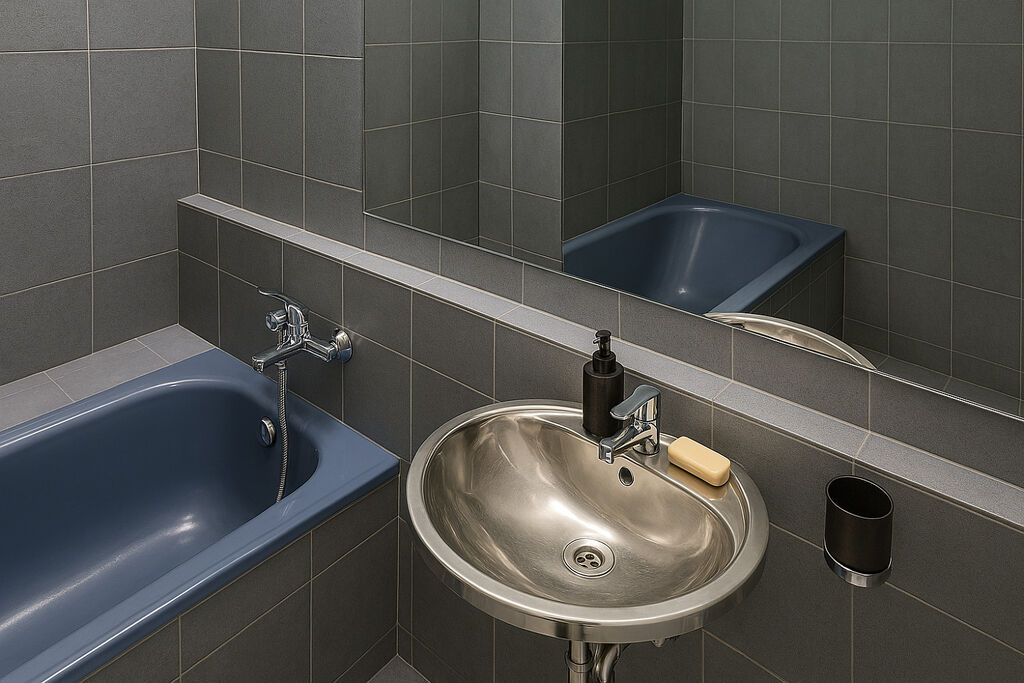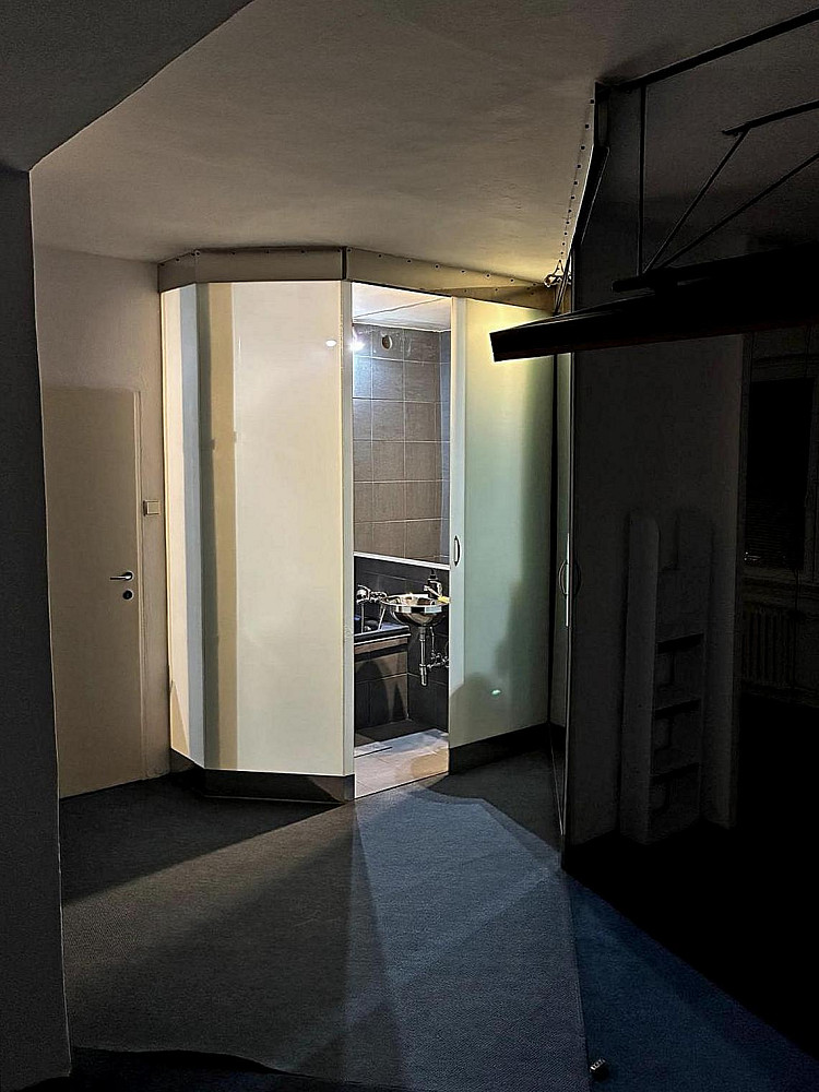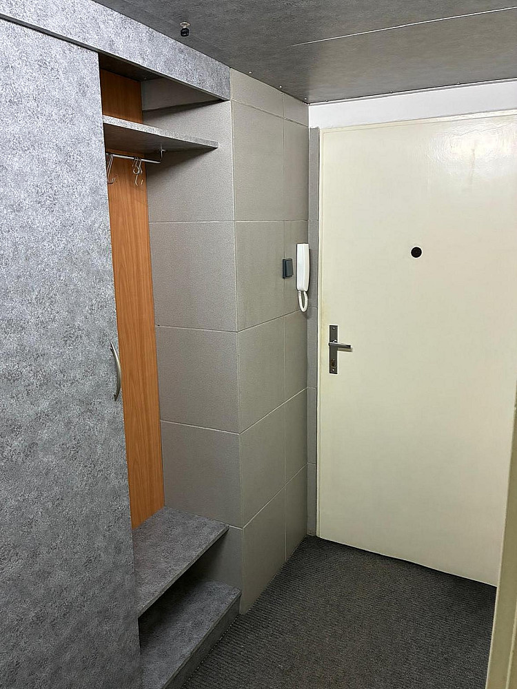 Po vstupu do bytu vás přivítá předsíň laděná do elegantní šedé barvy, zde je vstup do samostatného WC s malým umyvadlem, rovněž v šedém tónu. Kuchyně je v moderním černém designu, vestavěné spotřebiče jako myčka, pračka, mikrovlnná trouba a lednička vytvářejí prostor, kde je radost vařit i trávit čas. Koupelna je stylová a neotřelá – modrá vana, plechové umyvadlo a šedé kachličky tvoří harmonický celek, který zaujme každého milovníka designu. Hlavní obytný prostor vznikl spojením dvou pokojů do jednoho velkého, vzdušného celku. Díky chytrému řešení je možné prostor kdykoliv rozdělit – pomocí stropní zástěny a zasouvací zrcadlové stěny si vytvoříte soukromí podle potřeby.