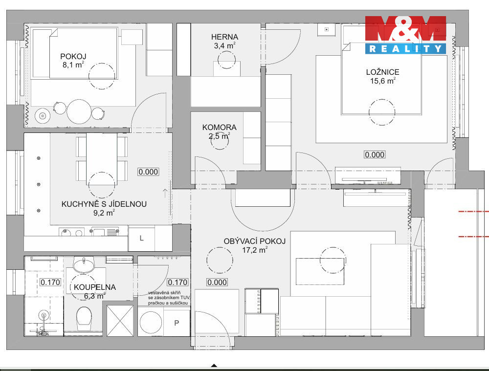Atypický byt má chodbu spojenou s obytným prostorem, odkud vejdeme buď do kuchyně, ložnice, komory anebo do koupelny s WC. Z kuchyně se pak průchodem dostaneme do ložnice druhé. Ta první je větší a ještě navíc má svoji šatnu. Dále je tu lodžie, na kterou se dostaneme jak z obývacího pokoje, tak z velké ložnice.