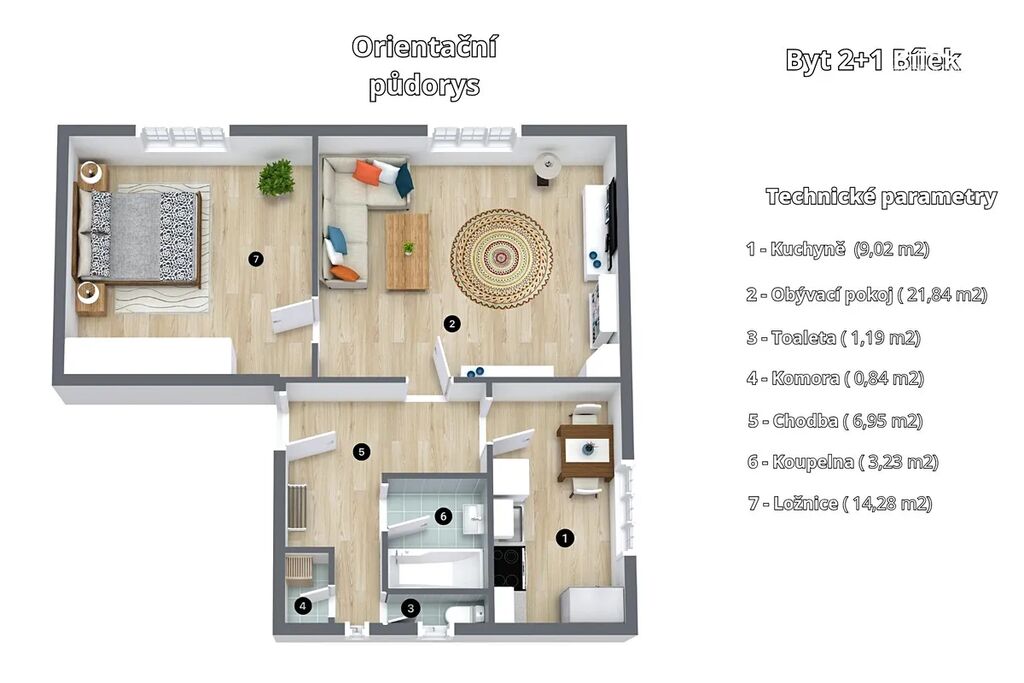 Dispozičně je řešen prostornou vstupní chodbou, po levé straně je toaleta, koupelna s vanou a umyvadlem, v zadní části chodby je komora, dále se chodbou dostaneme do kuchyně s kuchyňskou linkou, obývacího pokoje a ložnice s parketami.